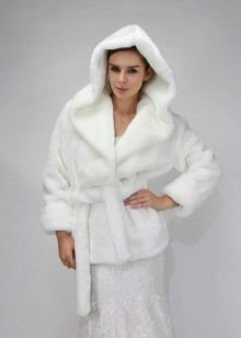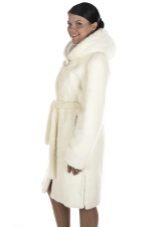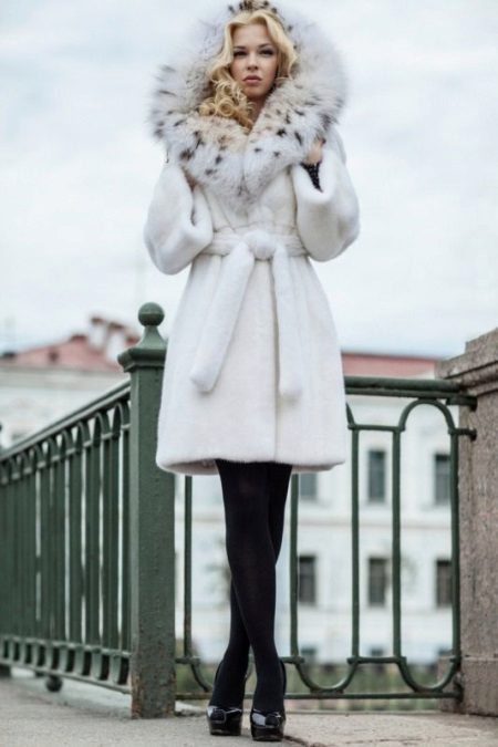- A white short-haired fur coat is knee-length and will look great with a dress or skirt and tight black tights. This fur coat has a large hood with a fluffy fur trim with a light spotty print. If you go to any event, and you have to, just gracefully get out of the car, you can wear smart high-heeled shoes. But for a long walk on the street, we advise you to buy a pair of stylish boots.