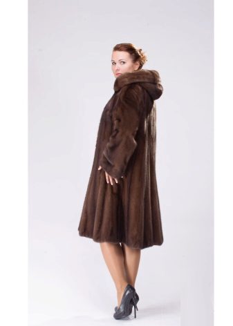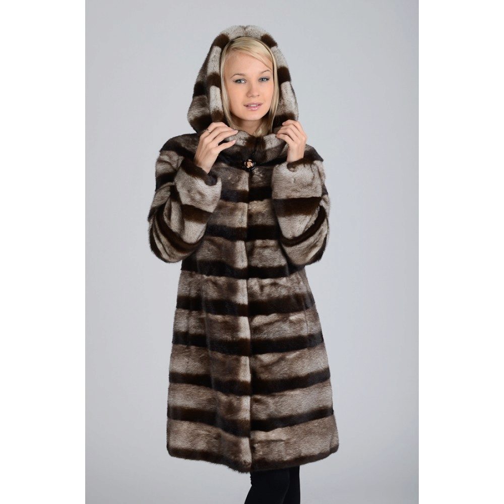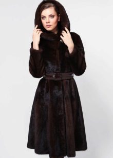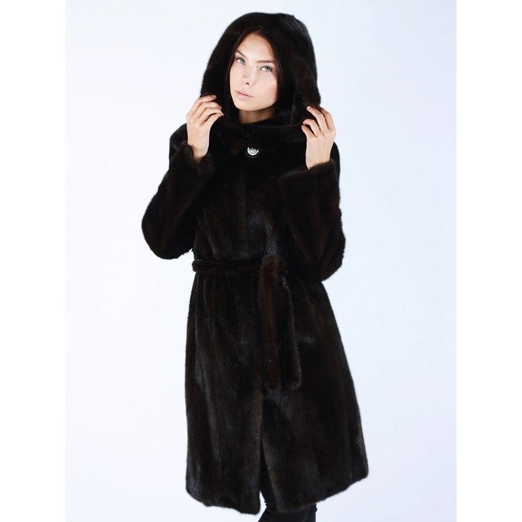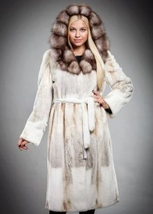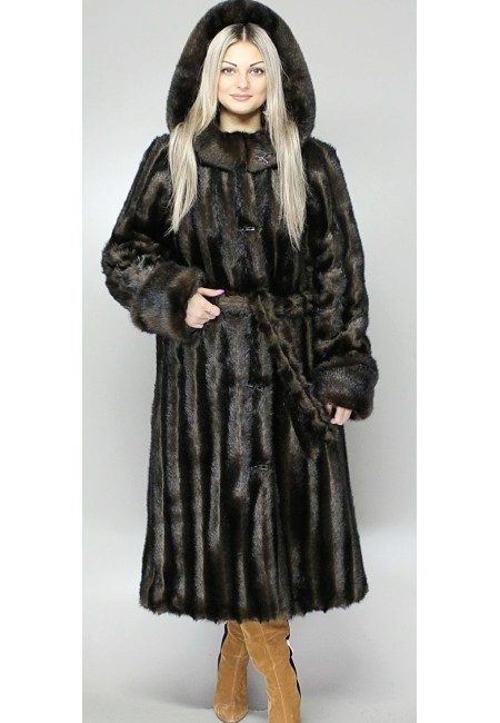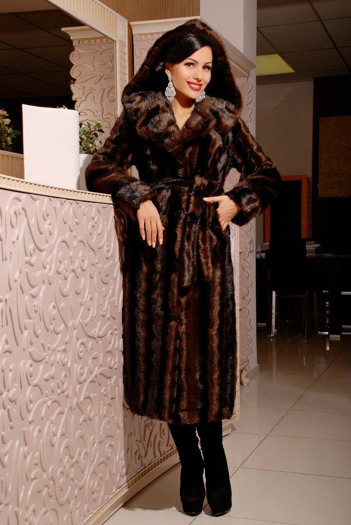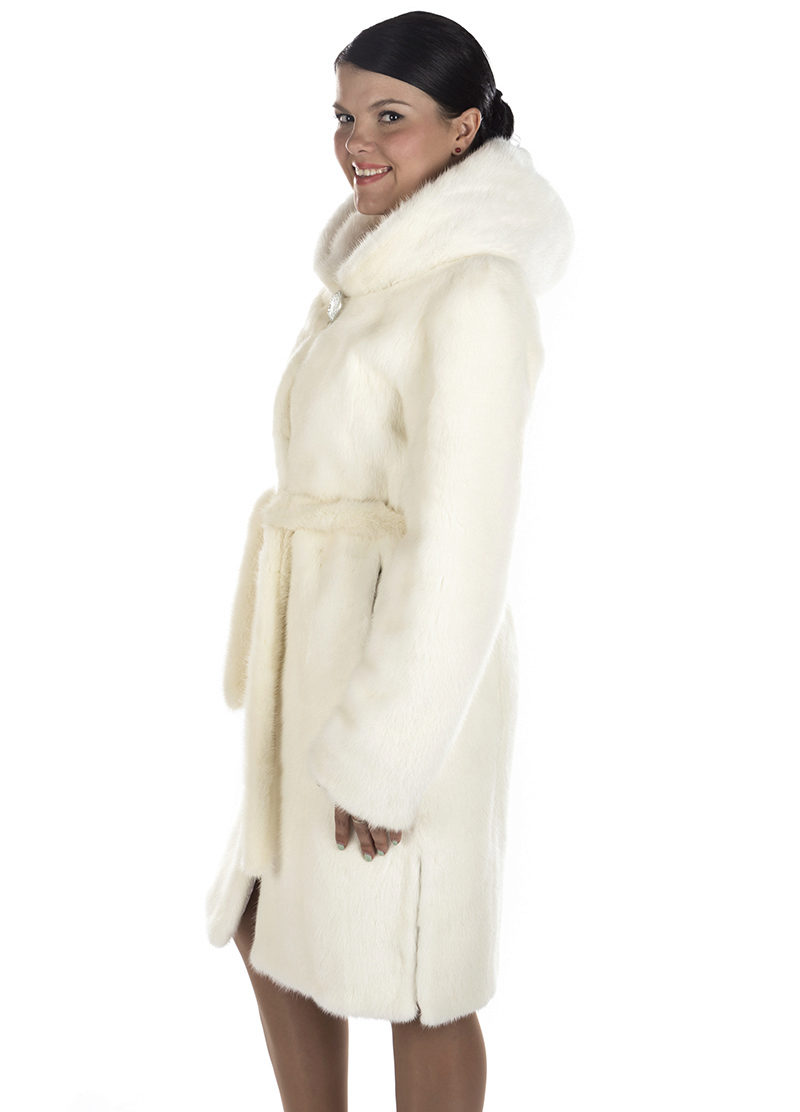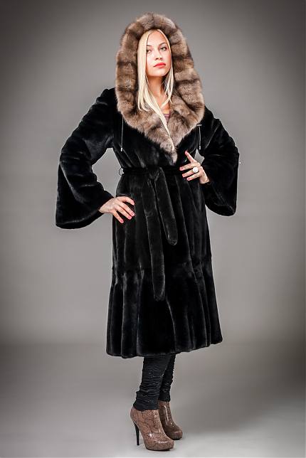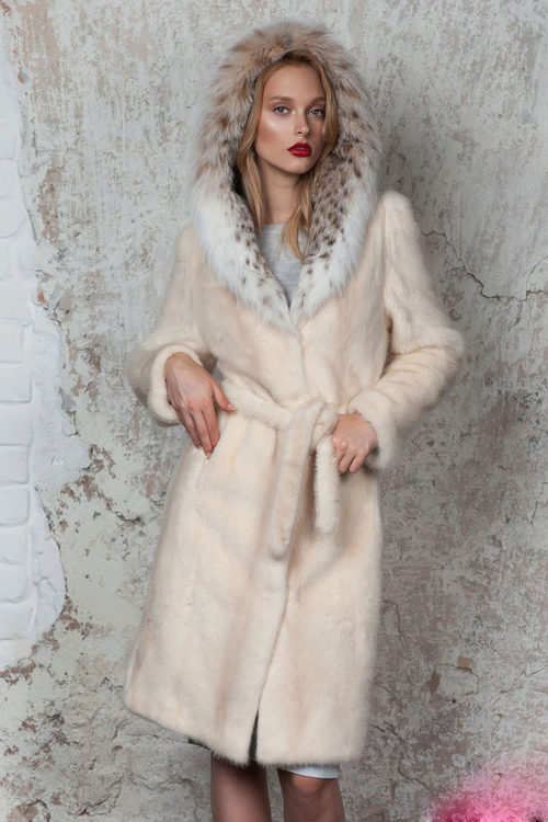 - A sheared mink fur coat has an animal print on a white background and is complemented with brown fur pieces in the inside of the hood and the sleeve area. This product is a fur coat - a bathrobe, which is complemented by a belt of the same fur. Midi length gives the product an incredibly luxurious and feminine look, and in combination with high leather boots with heels, the image will turn out to be royally chic. This model of a fur coat can be combined both with skirts, and with trousers.