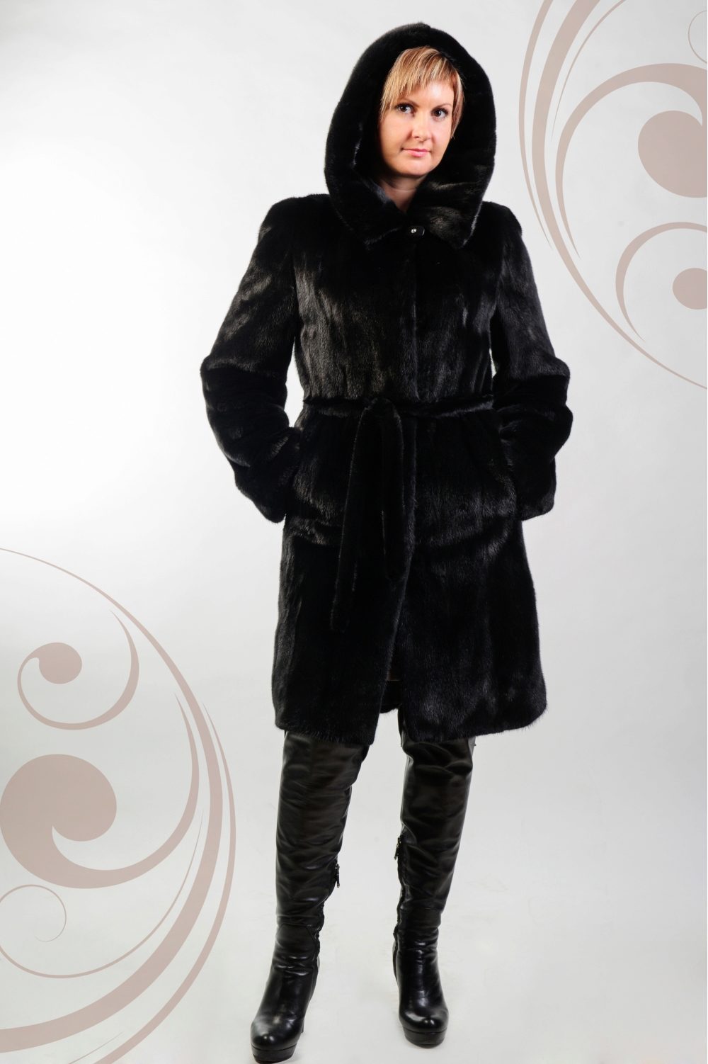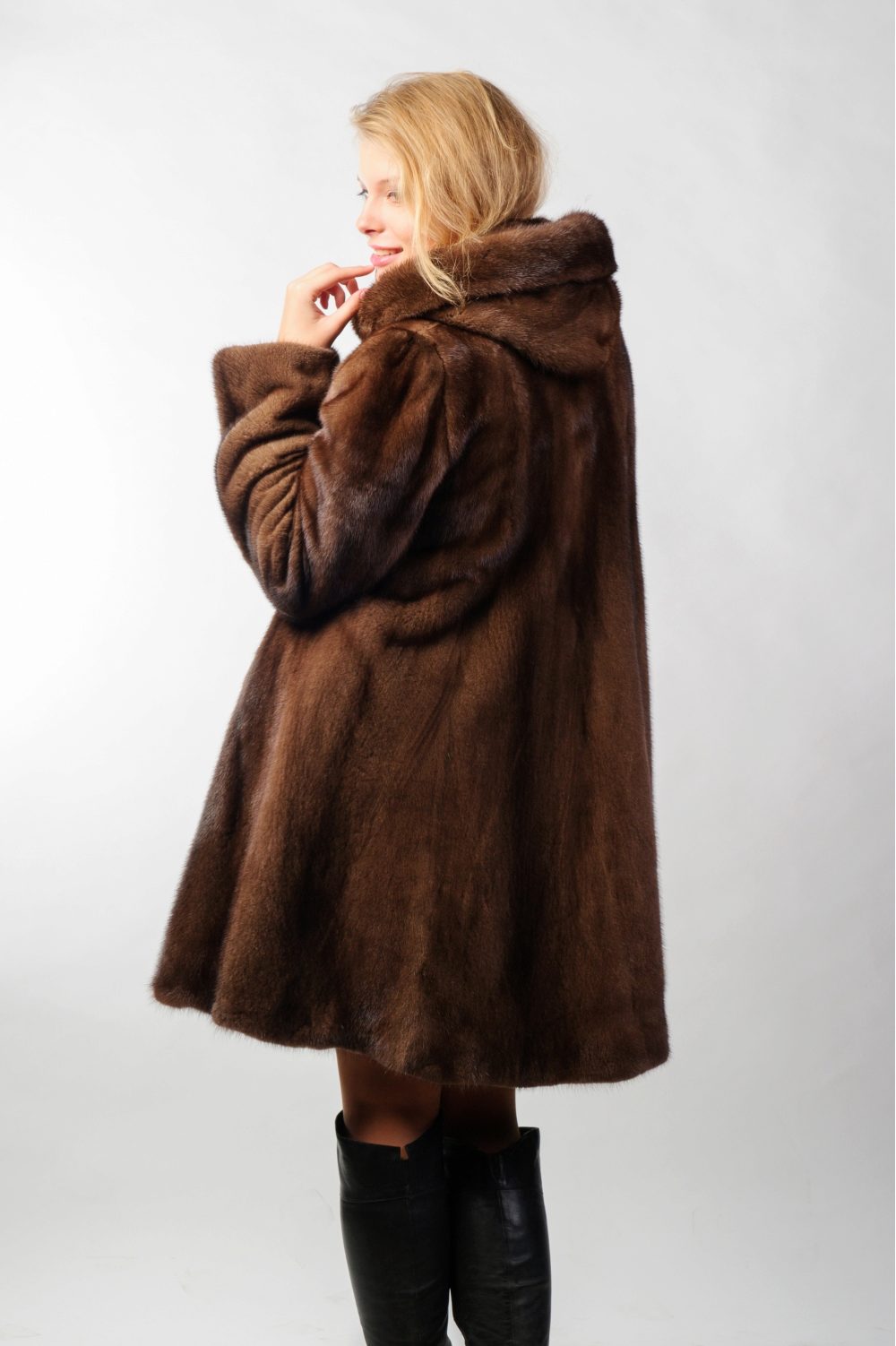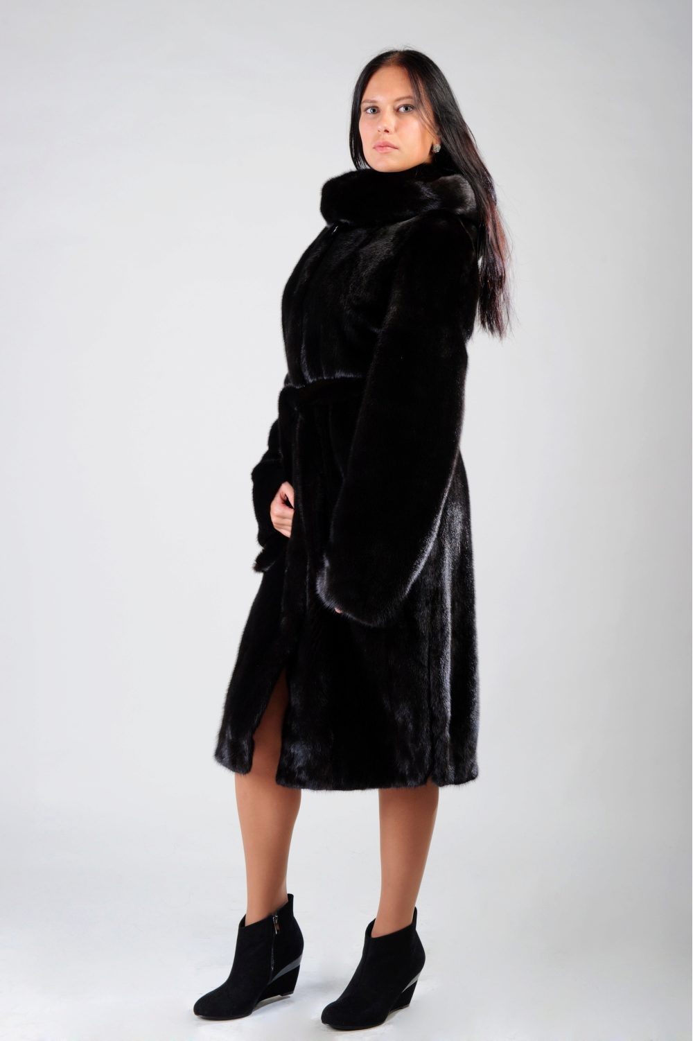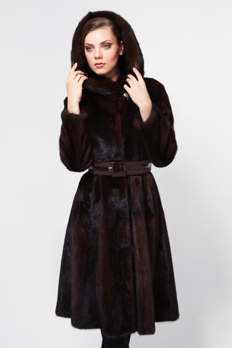 - A sheared mink fur coat has an animal print on a white background and is complemented with brown fur pieces in the inside of the hood and the sleeve area. This product is a fur coat - a bathrobe, which is complemented by a belt of the same fur. Midi length gives the product an incredibly luxurious and feminine look, and in combination with high leather boots with heels, the image will turn out to be royally chic. This model of a fur coat can be combined both with skirts, and with trousers.