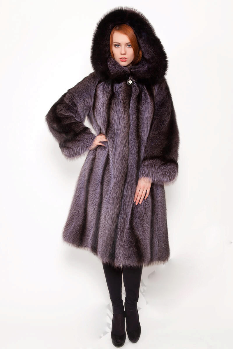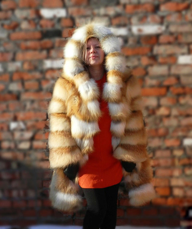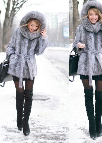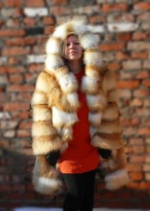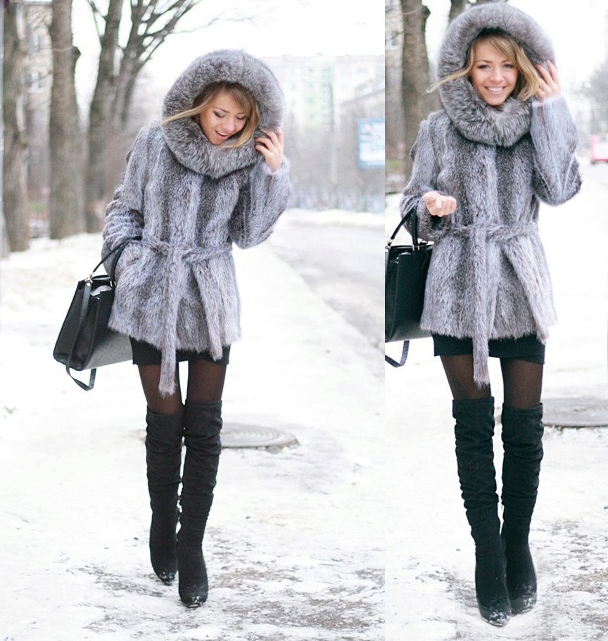 - A fluffy fox fur coat with a large hood will be an excellent option for residents of cities and countries with frosty climatic conditions. The model, up to mid-thigh, will be perfectly combined with both trouser and skirt bottom. The product is incredibly warm, so it does not need to be supplemented with a thick knitted sweater, which means that you can pick up any blouse. As shoes, both heeled and flat-sole models are suitable, including winter boots, fur boots and cute uggs.