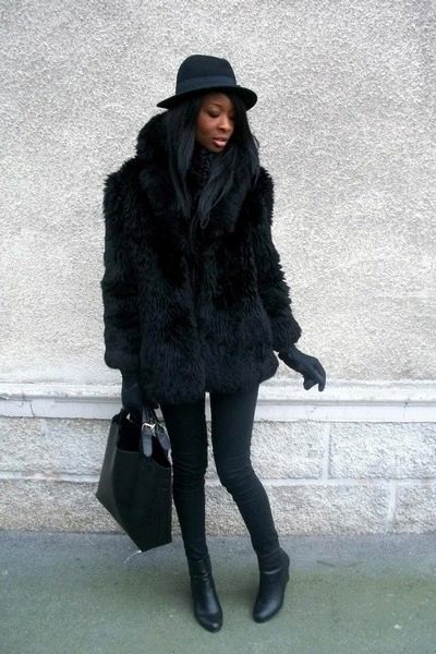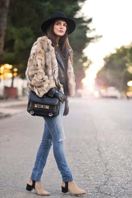 - The shortened model of a fur coat made from pieces of wolf fur also has a hood and a oversized style. The product looks a little bold, so it will be perfectly combined with a leather jacket and light jeans with torn knees. Beige suede boots with a small square heel in black look very strong and perfectly fit into the outfit. And as an accessory, a black wide-brimmed hat with a wide brim, a black bag with a long strap and leather gloves are perfect - everything ingenious is simple, harmonious and stylish!
