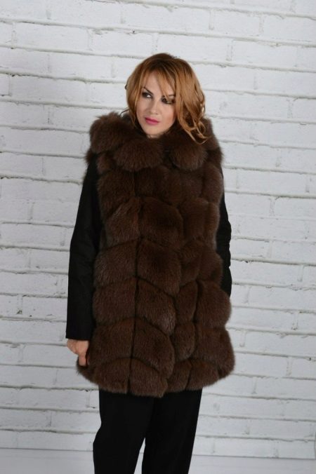 A gorgeous fox fur coat in the color of cappuccino is combined with black suede sleeves, which visually highlights its future transformation into a fur vest. Due to this combination, outwardly, the clothes do not seem to be voluminous, on the contrary, it has acquired clear forms of silhouette. Fur hood adds originality to the vest. Due to the transverse lines of the fur coat - the vest looks elegant.
