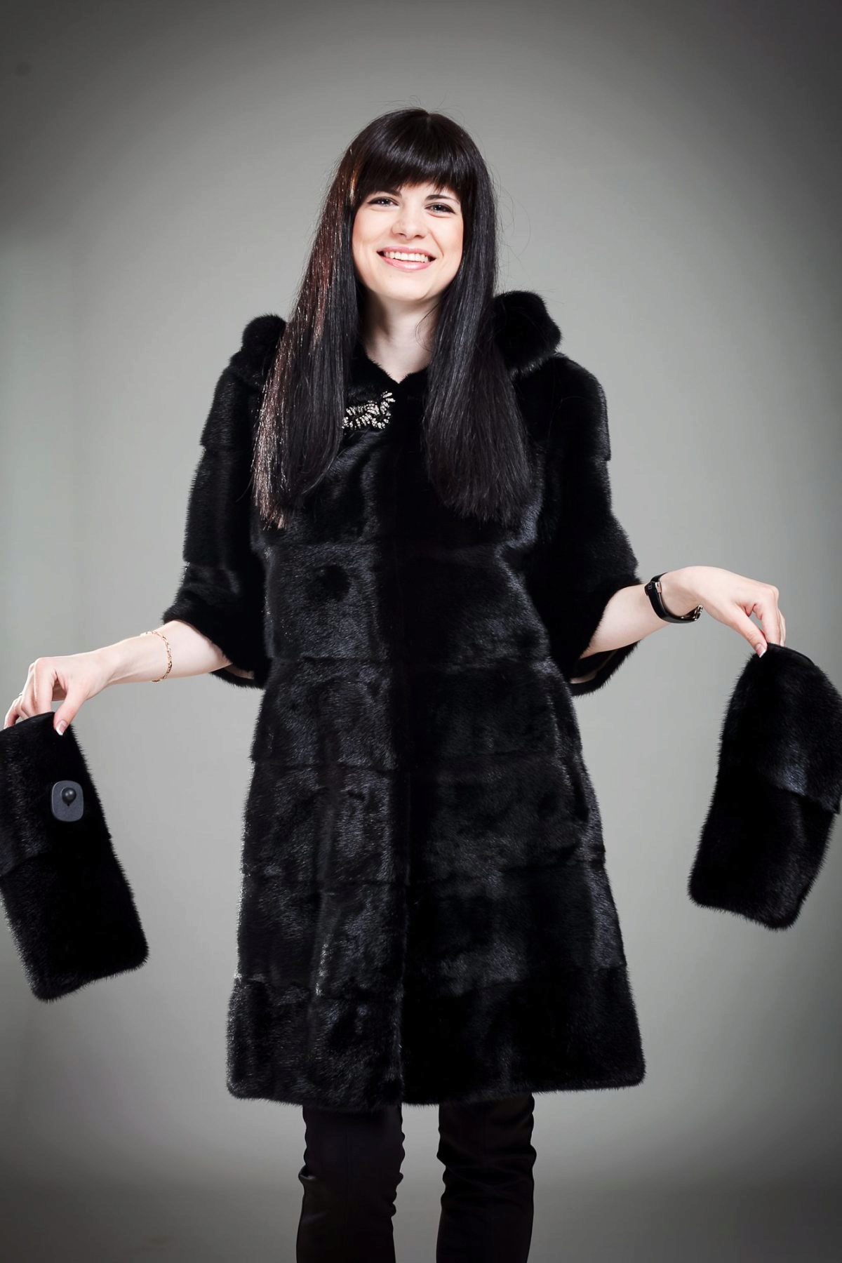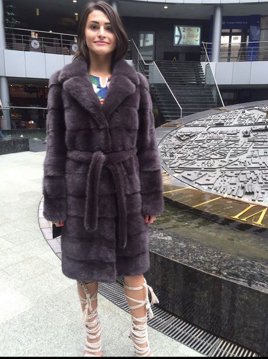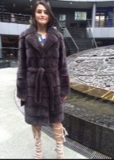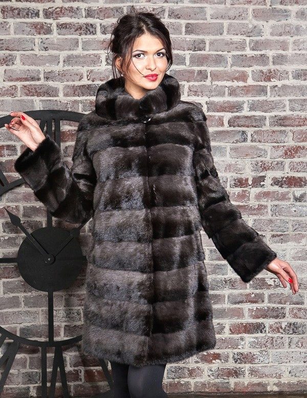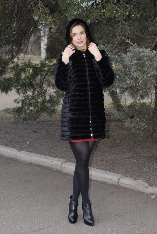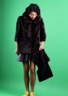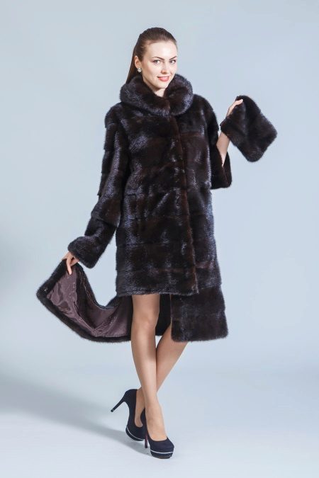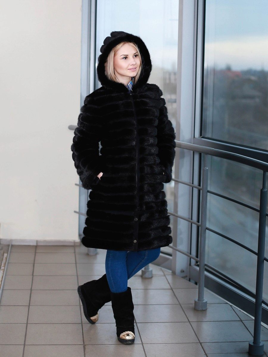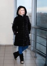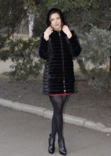 The fitted mink coat is transverse with a secret: the sleeves and the hem of this model are easily shortened, making it possible to make an elongated fur coat, in which any cold is not terrible, into a light-season outfit. An elegant hood eliminates the need to choose a headdress for luxurious fur, so that the only addition to the already spectacular image will be elegant black shoes, emphasizing the slimness of the legs and tall girls.
