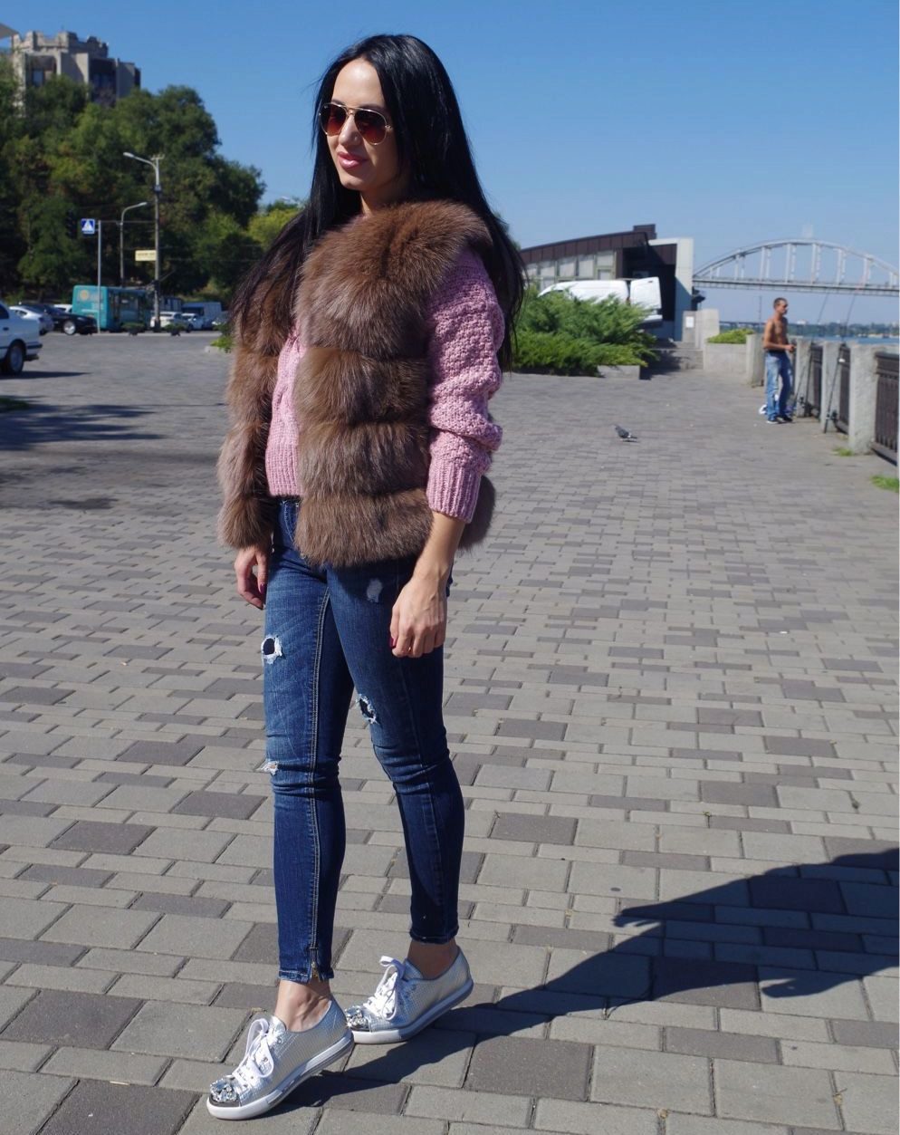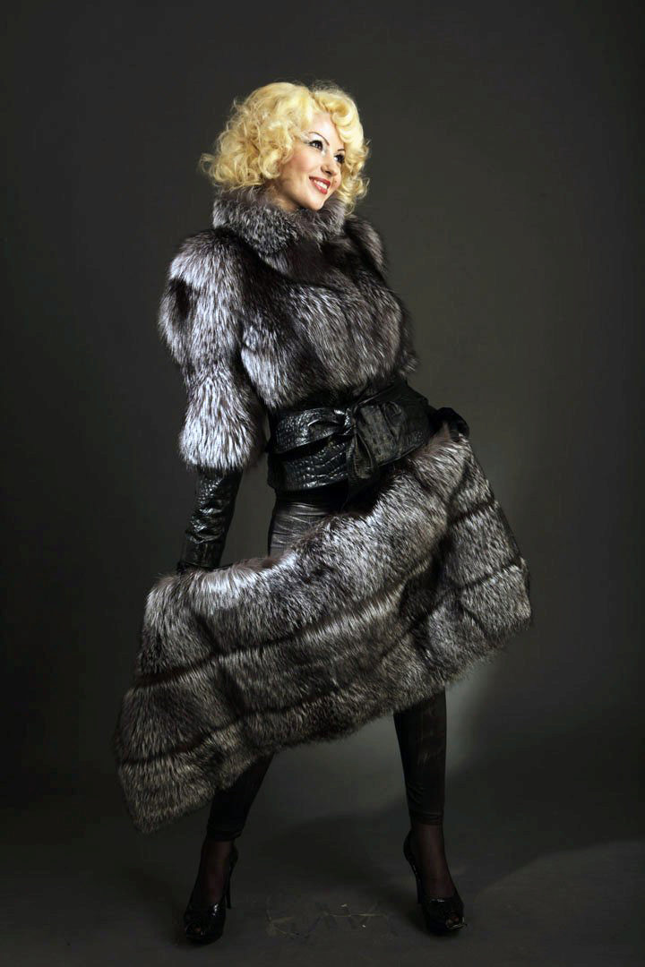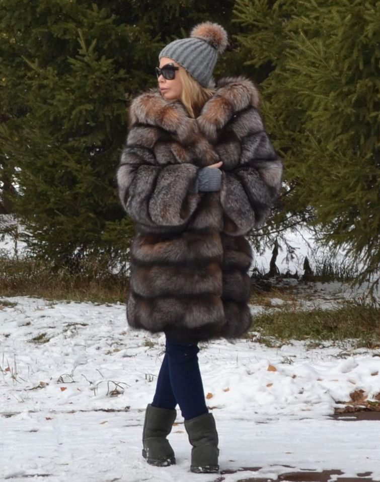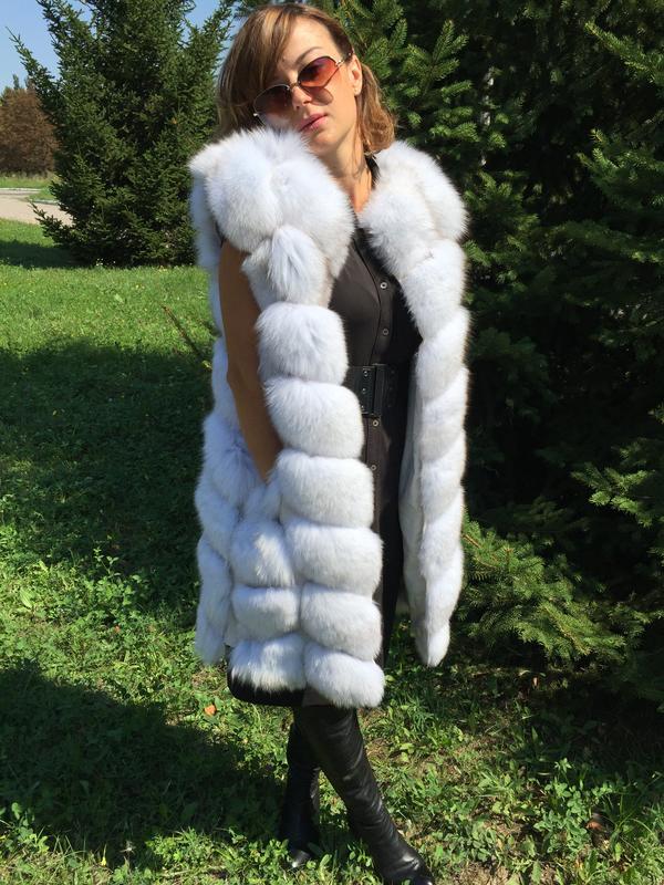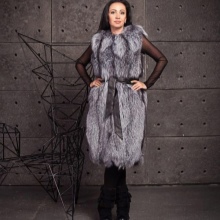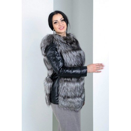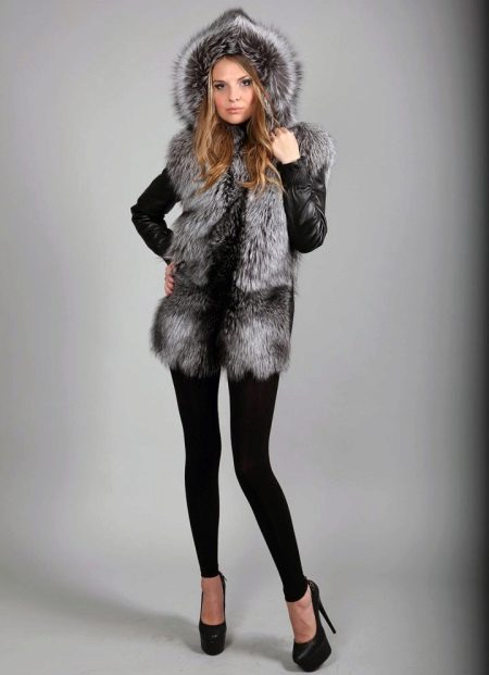 A bold fur coat-vest that combines the nobleness of the fox's silverfoot fur and the reserved luxury of natural leather, from which not only removable sleeves are made, but also vertical inserts on the sides of the vest. A spacious hood does not create a feeling of bulkiness - it literally flows over the girl's head, making a favorable emphasis on the light shade of hair. Wearing black leggings, this transforming vest looks great with or without leather sleeves.
