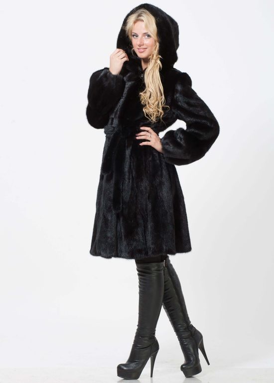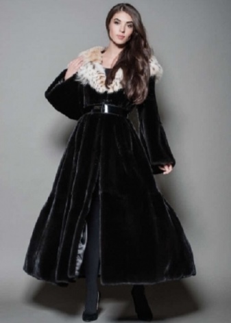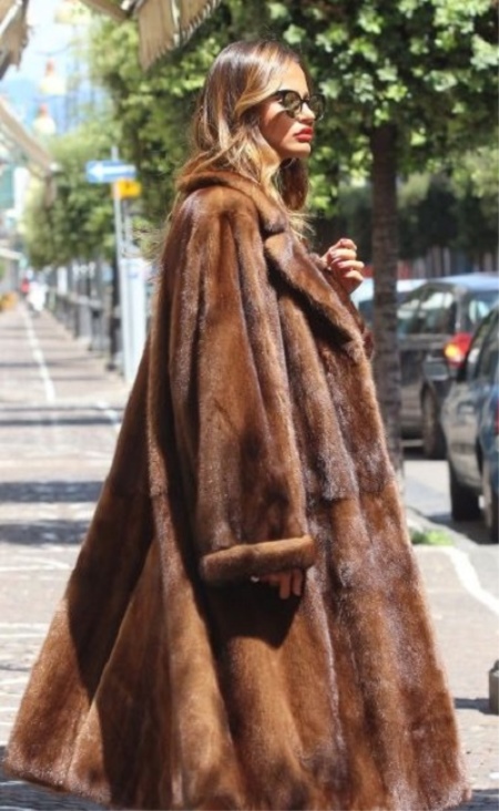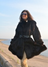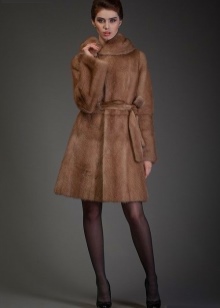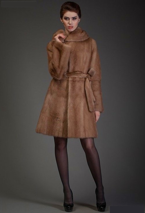 - Model trapeze fur coat, resembling a dress, is a good option for young beauties with slender legs. Such a style suggests the presence of a wide belt, which highlights the upper fitting part. It also emphasizes a wide bottom, resembling a skirt-sun.