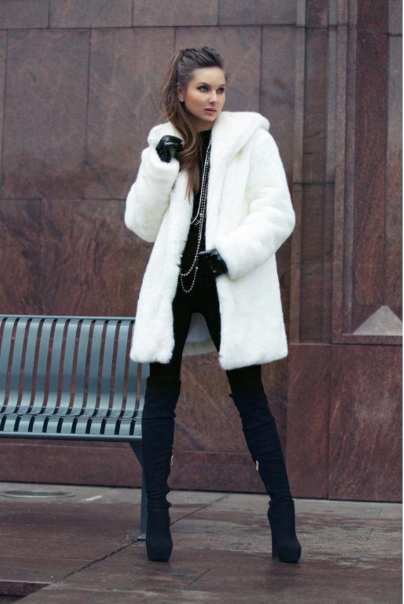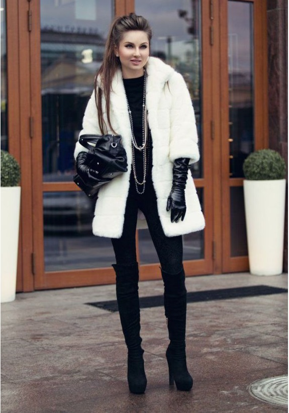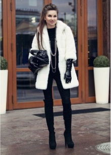If the girl still wants to wear a dress or skirt, then you should choose the length just above the hem of a fur coat. Knitted dresses in combination with leggings or tight tights will also suit a trapezoid fur coat.