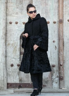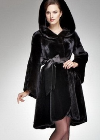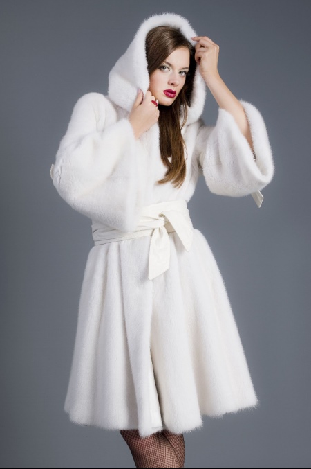 Playfully and youth looks model fur coat-trapezoid, resembling a dress. The choice of originality will be helped by the choice of a belt, in this case a volumetric bow, tied at the waist, gives a winter look to femininity.