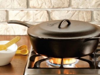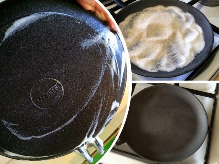 For calcining, you can use regular table salt or vegetable oil. If you use the first option, you will need to pour a thick layer of salt in the pan and put it on a small fire. When the pan is fully cast iron, without a protective coating or plastic inserts, it can be placed in the oven. Models with a protective layer are not hot.