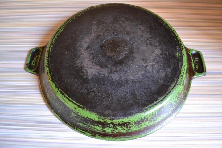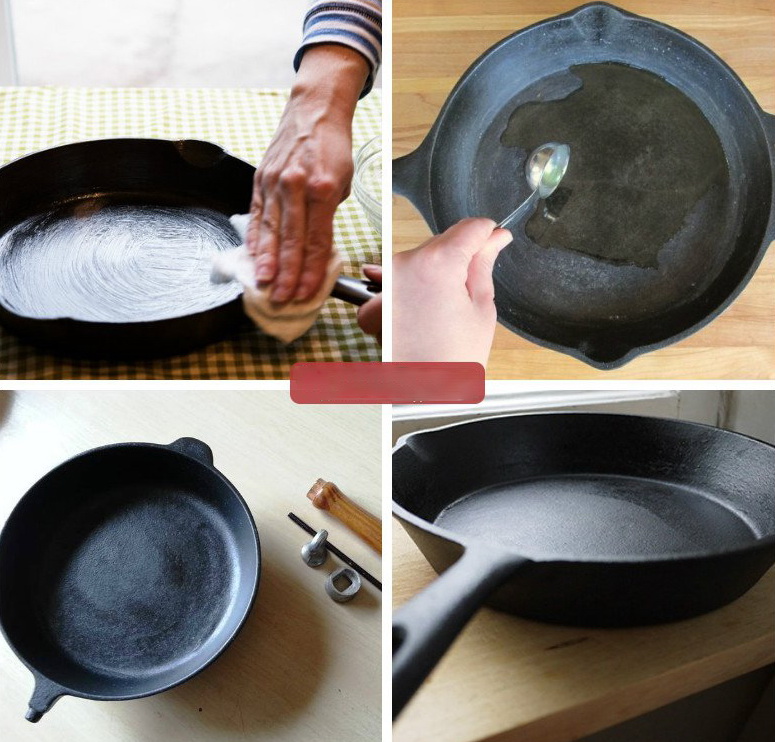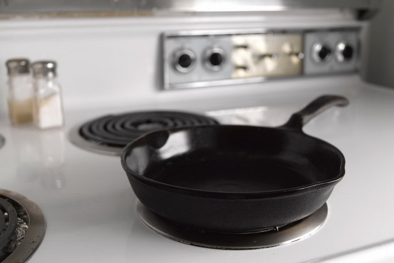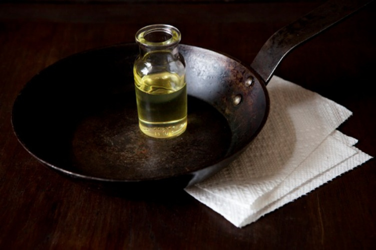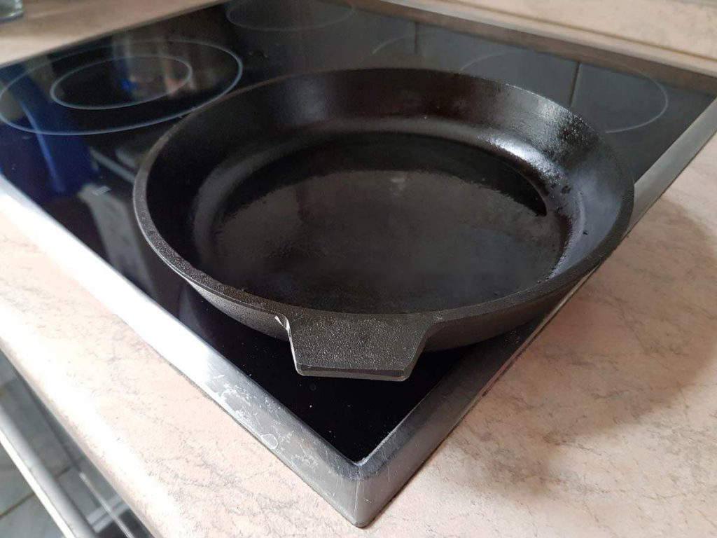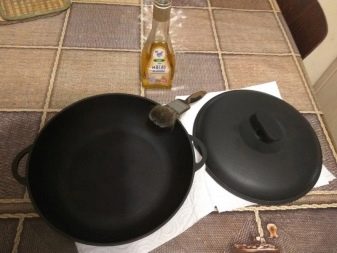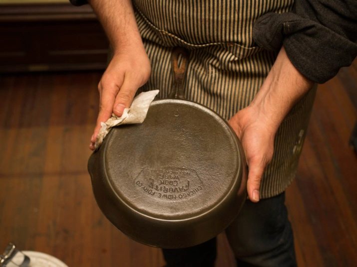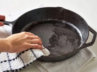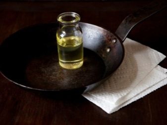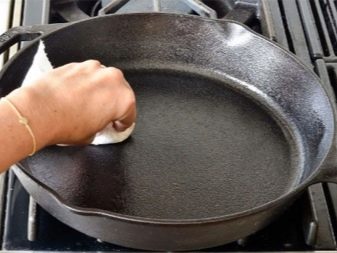 In the process of frying the pan, the primary task of the hostess is to treat it with oil, which, when heated, penetrates the pores and remains there. If the pan has no cracks, then even old dishes can be put in order. First, rust is removed from its surface, then the cast iron is heated and sunflower oil is applied to it. Cookware allowed to cool.