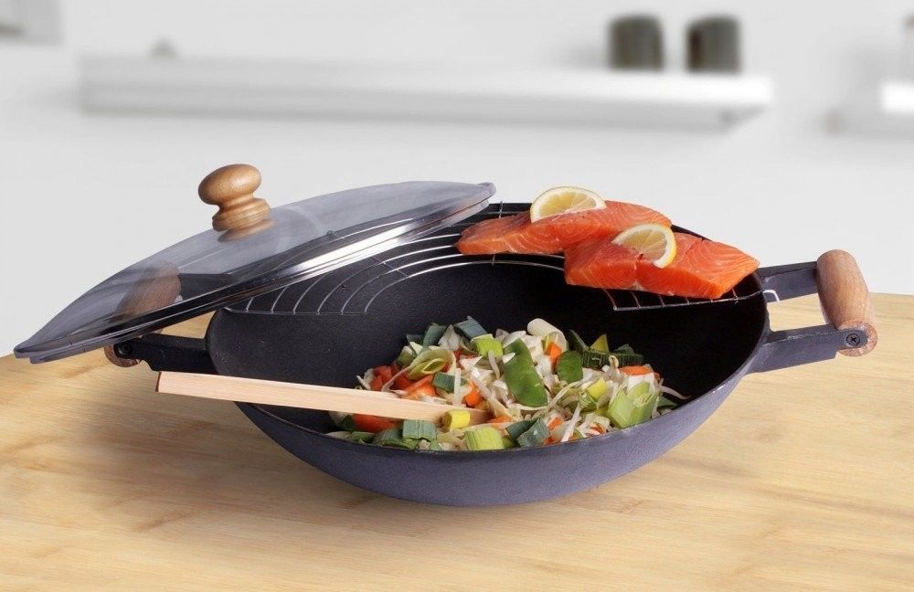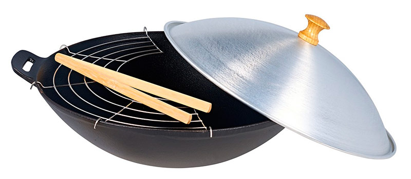 - Baumalu. Produces good woks with a diameter of 360 mm. For ease of use, the design provides two handles. Walls 8 mm thick - the ideal solution for roasting and stewing meat. Models come with a grill, it is used for steam cooking.