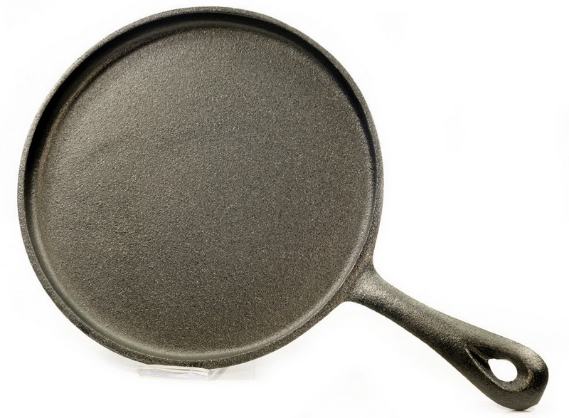 Universal cast iron products are made without coating. On pure metal it is allowed to cook any dishes, while they do not lose their flavor. Such dishes can withstand heating even over an open fire. On sale there are small pancake options with a diameter of 500 mm.