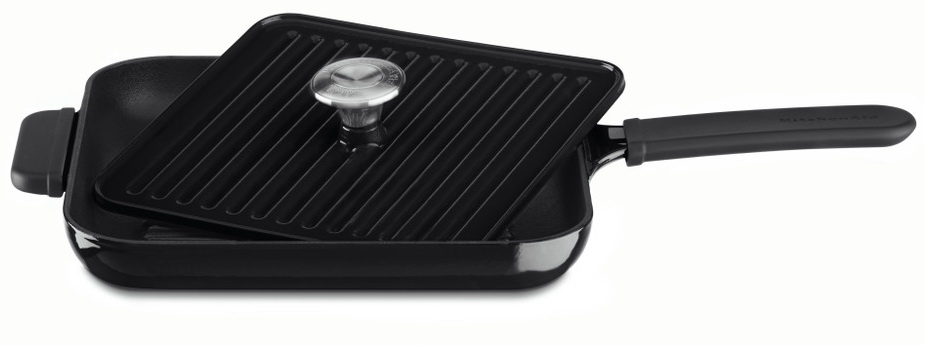 - "KitchenAid KCI10GPOB". Grill pan - a non-standard solution for those who are accustomed to quickly organize a picnic. The package includes silicone handles. This material does not heat up even if you put the dishes in the oven. Available for sale with a cover press. On sale can be found in three colors. Of the advantages, you can select high-quality enamel, the ability to use on any plate. You can set the dishes in the oven, preheated to a temperature of 250 degrees. Disadvantages of the model - a lot of weight and cost.