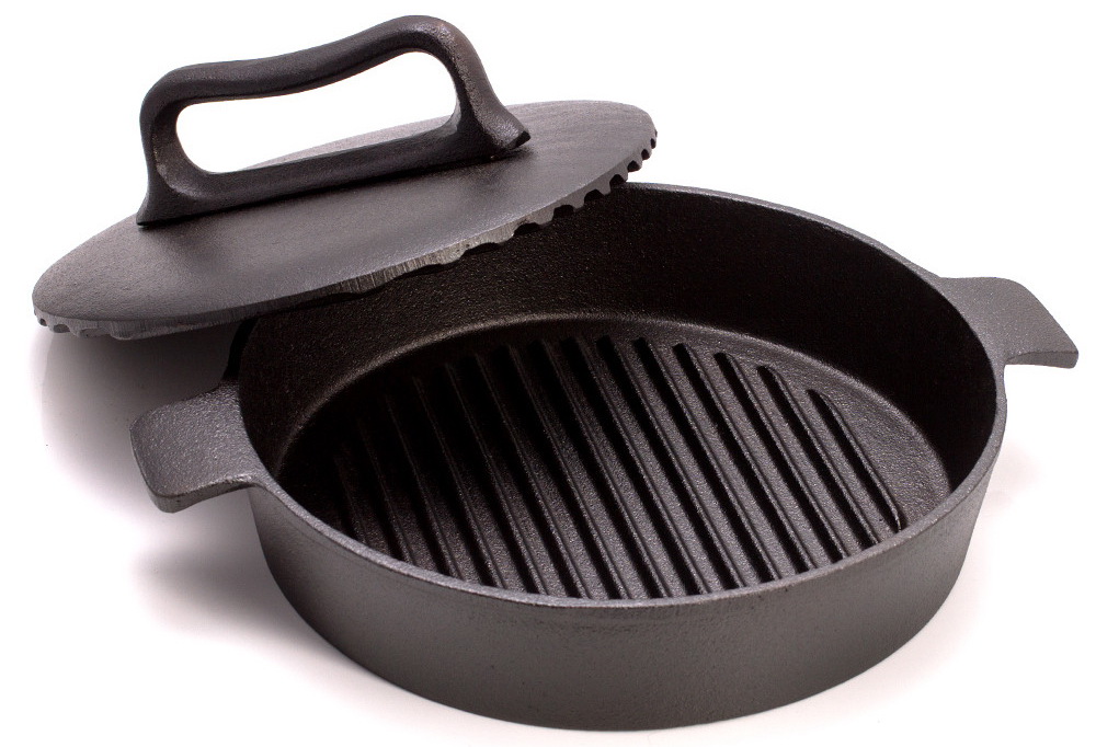 - Myron Cook Evolution GR24SET. Model pan with press cover. The diameter of the product is 240 mm. There is a cover in the configuration, its size is slightly smaller. This feature allows you to press the steak to the hot surface and get it with a characteristic grooved notch. The handles of the pan are wide, monolithic. The product can be used for cooking in the oven.