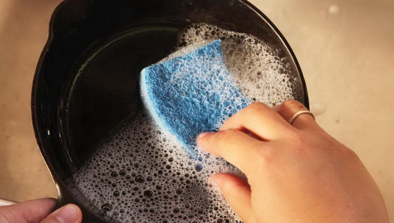 You can effectively remove the layer by soaking the pan in hot water with a small amount of liquid soap. When the cast iron can be cleaned, you can wipe it with a towel and smear it with sunflower oil. It is necessary to store utensils in a well-ventilated cabinet, since mold and rust can form in a frying pan under high humidity.