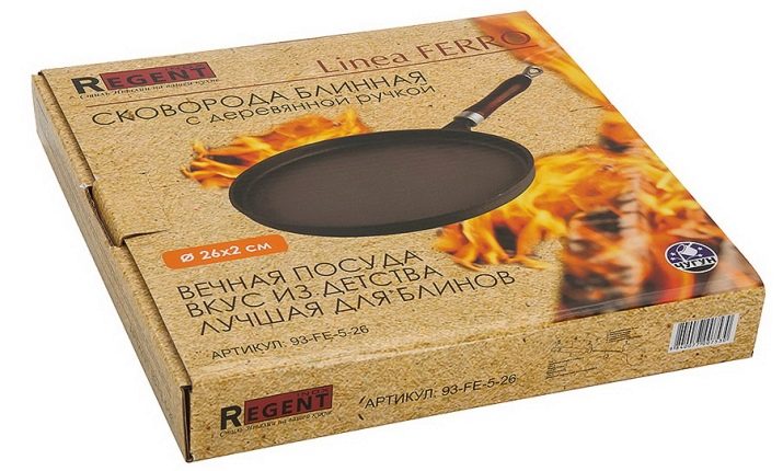 - Regent Inox Linea Ferro. Pancake frying pan, which has a standard two-centimeter rim and a diameter of 260 mm. The handle is made of wood, if necessary, it is easily removed. If necessary, the pan serves as a baking dish, equipped with an induction bottom. The model is being ignited in production, so you can start cooking your favorite dishes right after purchasing it. This is a rather heavy product weighing 2.6 kilograms, so it is better to cook pancakes on it with a spatula.