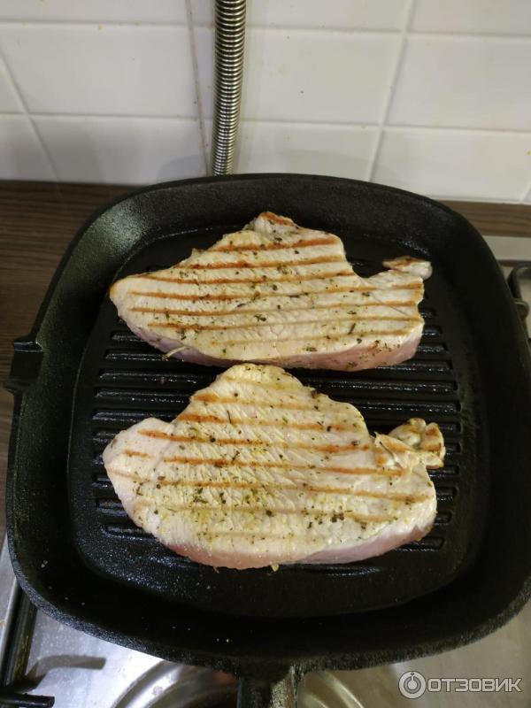 The properties of cast iron allow the meat to be well roasted, the metal heats up for a long time and makes it evenly distributed to heat. Although this pan cools longer than aluminum.