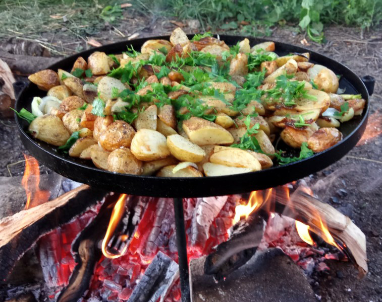 Frying pan - a kitchen fixture designed for frying and stewing food. It has a flat or semicircular shape of the bottom part. It can be equipped with a handle for holding during heating. The main materials from which the pans are made are: steel, cast iron, aluminum, stainless steel. There are modifications of pans that can be made by hand. One of the most common methods of manufacturing this device is the alteration of the harrow disk.