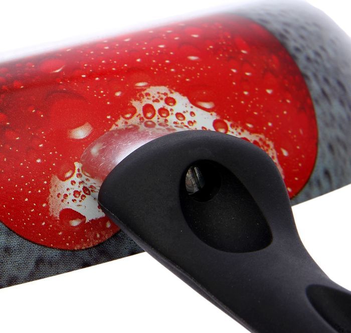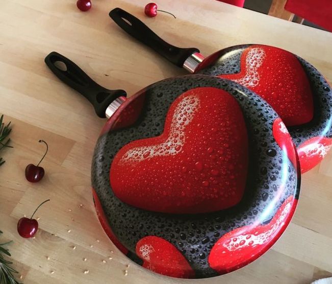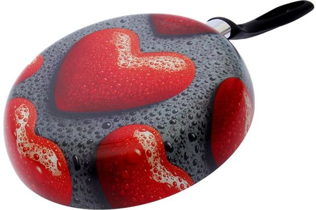 The most romantic and original design collection of pans with the image of a red stone heart and raindrops with a 3D effect. The series is represented by dishes with a glass lid and without it, with a diameter of 22-28 centimeters. Ergonomic handle tightly attached to the body. The outer coating is resistant to high temperatures, the inner layer has 5 layerswhich provide high non-stick properties.
