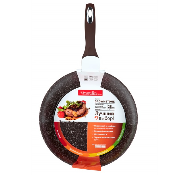 The product reviews of the Moulin villa brand are mostly positive. Buyers are very satisfied with the quality of the purchased goods. The pans are very comfortable and roomy, in models with a diameter of 28 cm you can cook dinner for the whole family. There is a complete lack of heating pens and their convenient form. Holders of dishes with a removable handle are happy with the opportunity to remove it by pressing one button and the fact that the appliance fits in any oven.