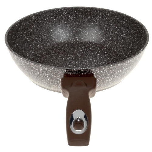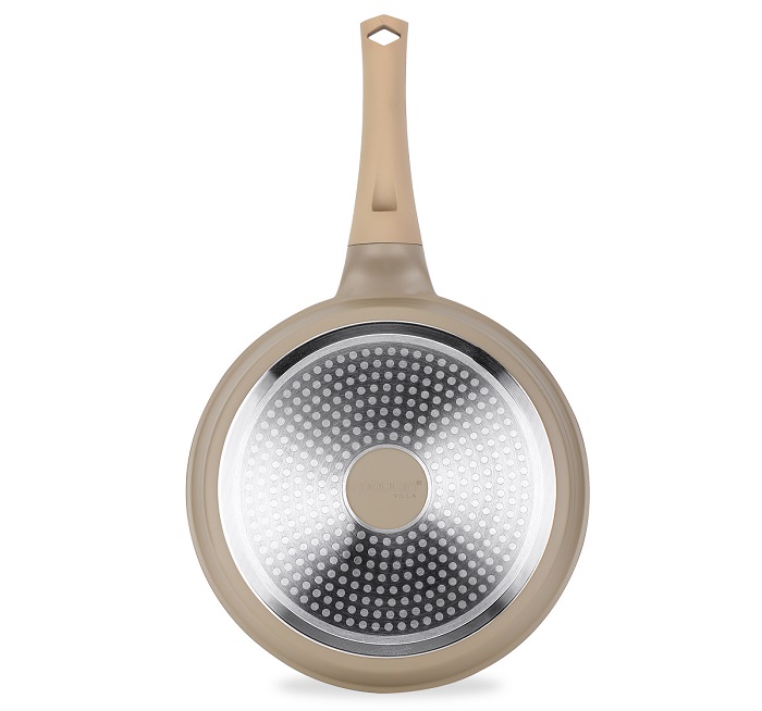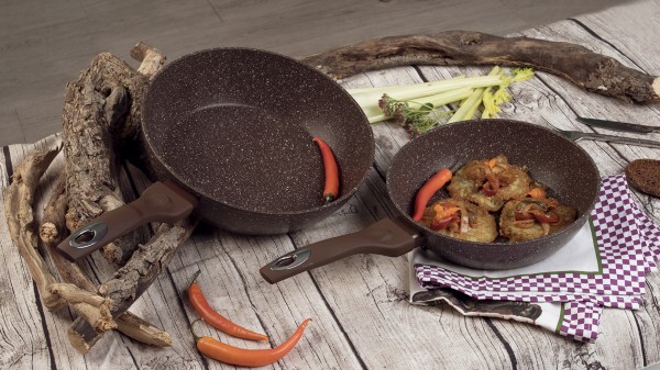 This line consists of 3 brown pans with a diameter of 24, 26 and 28 cm. The ergonomically shaped handles are made of high quality bakelite, and the Soft Touch coating prevents heating and ensures safety of use. Water based inner coating has anti-stick properties.therefore, a very small amount of oil can be used for cooking In the production of pans did not use either lead or cadmium, which are harmful to the human body. The surface consists of 5 layers and withstands about 11,000 abrasions.