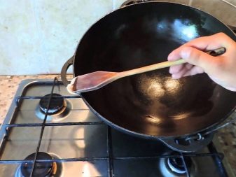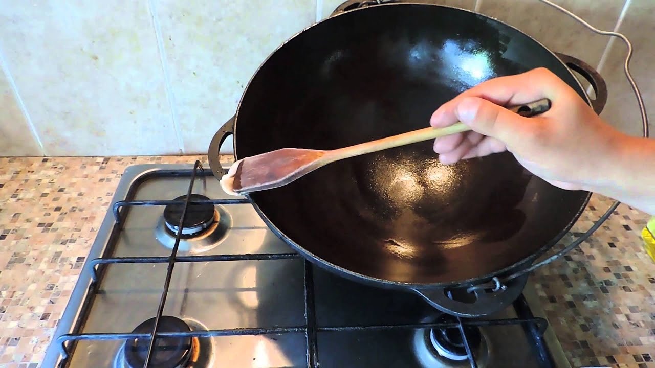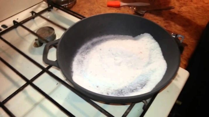 First fry thoroughly washed with hot water using detergent. After that, dried and glow on the fire until the gray metal. Then, in a heated dish sprinkle salt, which is held for 10 minutes, until a light, barely audible crackle. Next, the pan is washed with warm water, rubbed dry and, heated, lubricated with vegetable oil.