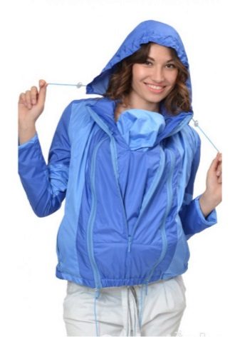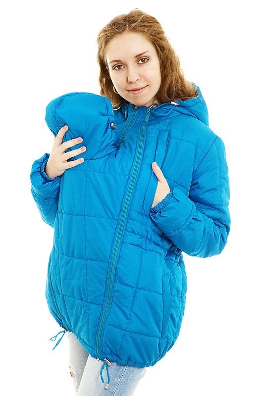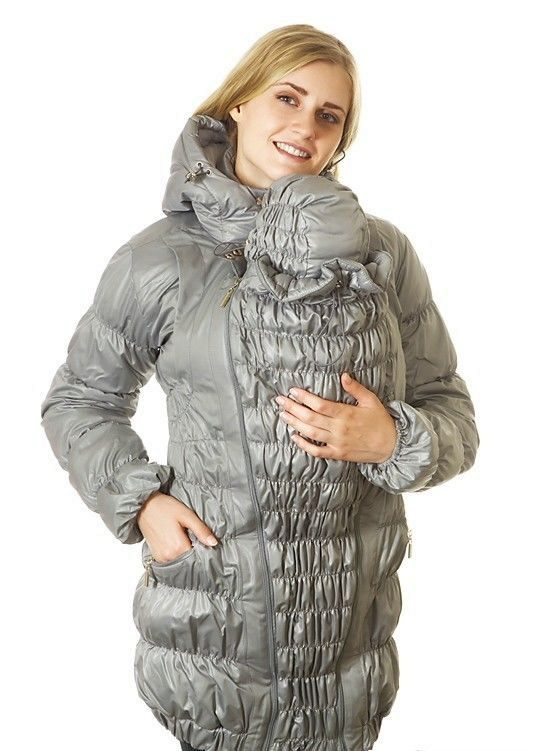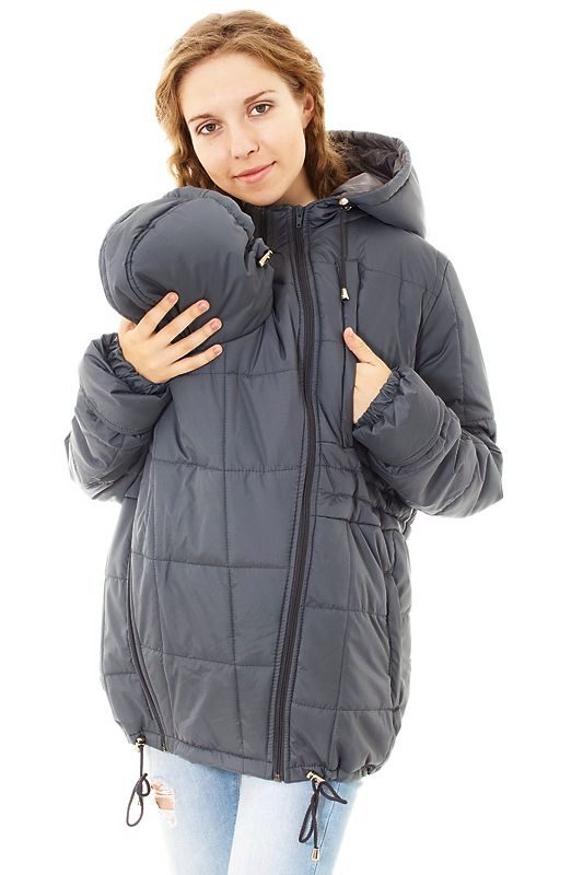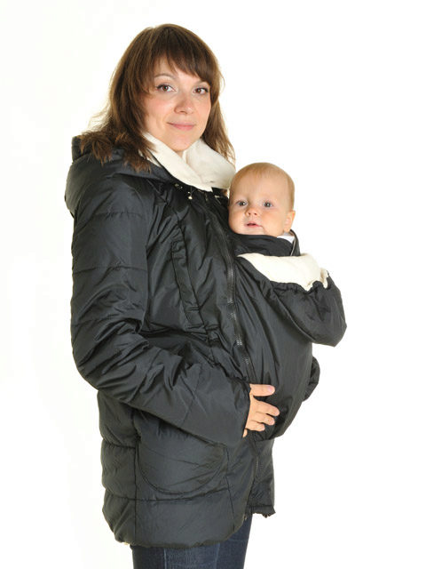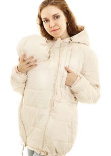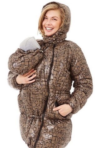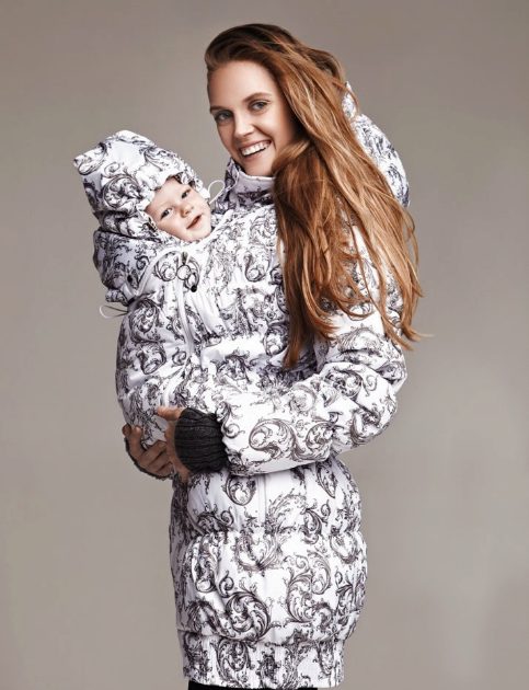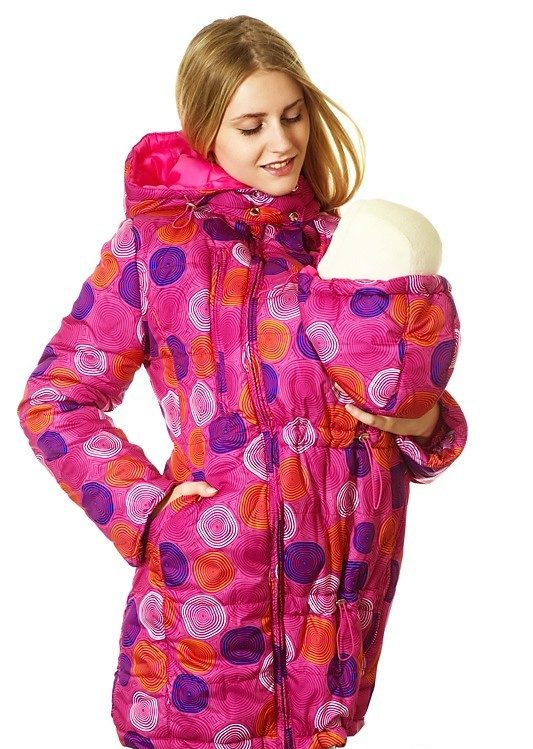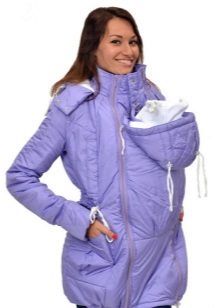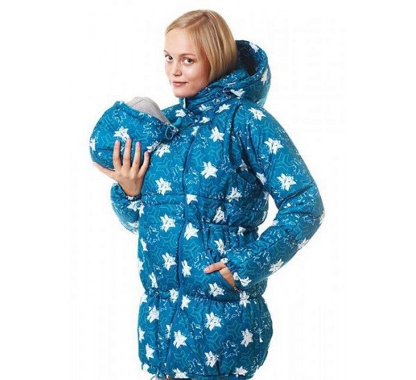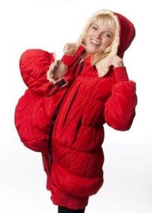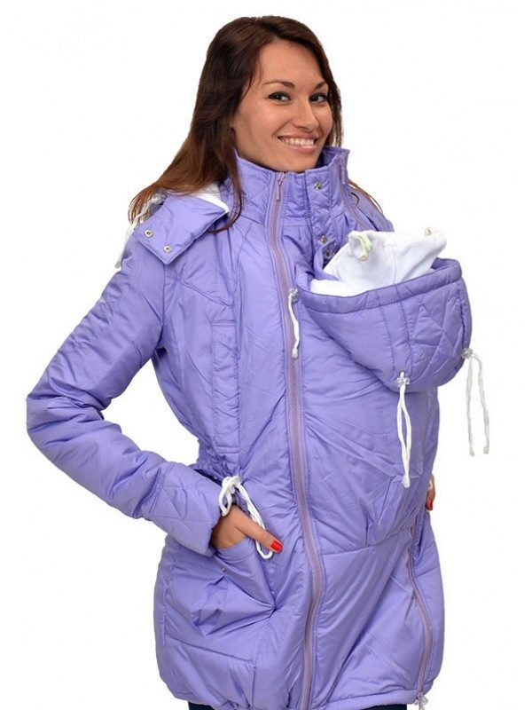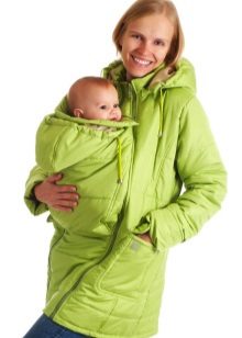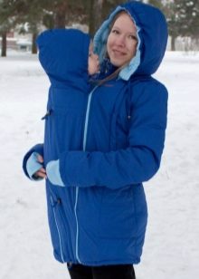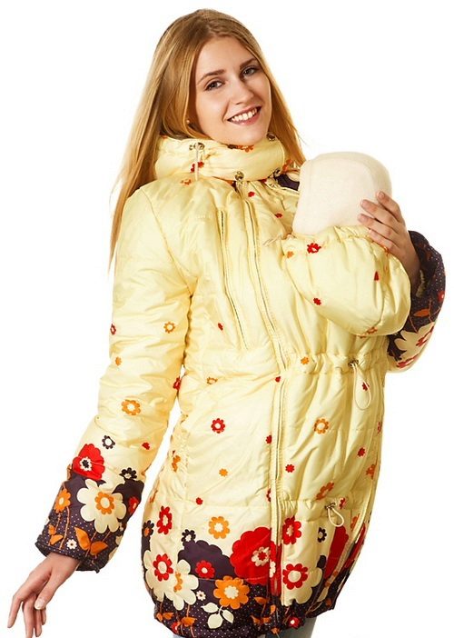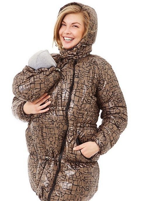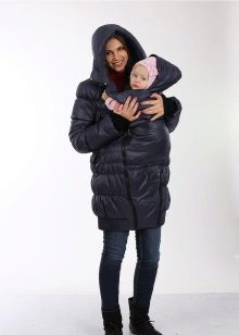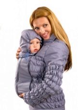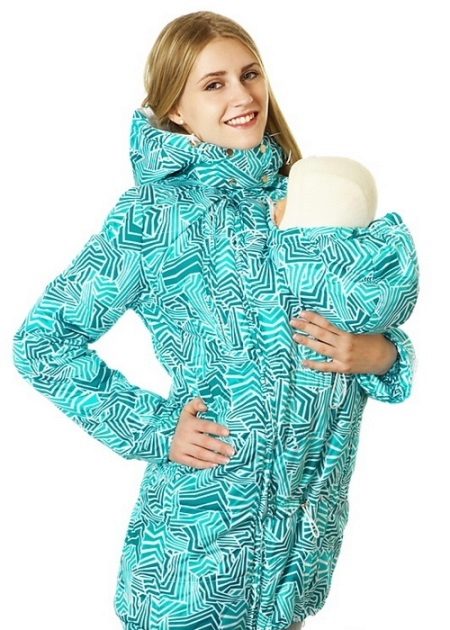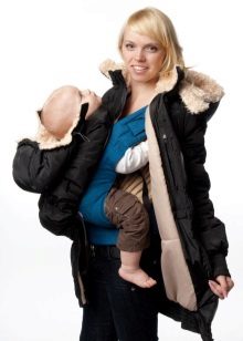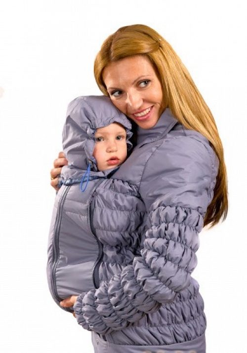Slingokurtki differ from conventional models in the presence of an additional insert, which is located in front. Most often, it is fastened on both sides with a zipper, thus forming additional space for convenient placement of the child. The insert can be adjusted in width and height, due to which neither you nor your baby will have to adjust to the standard dimensions of the jacket.