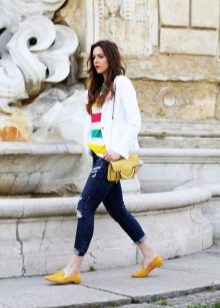 According to stylists, you should not wear too long trousers with sleepers. Some musicians and artists boldly wear classical costumes with them. Who can not afford the star epotage? For people not from show business, such a combination would be inappropriate. Jeans go well with sleepers. However, in this case you should pay attention not to the classics, but to the narrowed models. Instead, you can pick up sitting on the figure of chinos. This image can be complemented by a plaid shirt or sweatshirt.