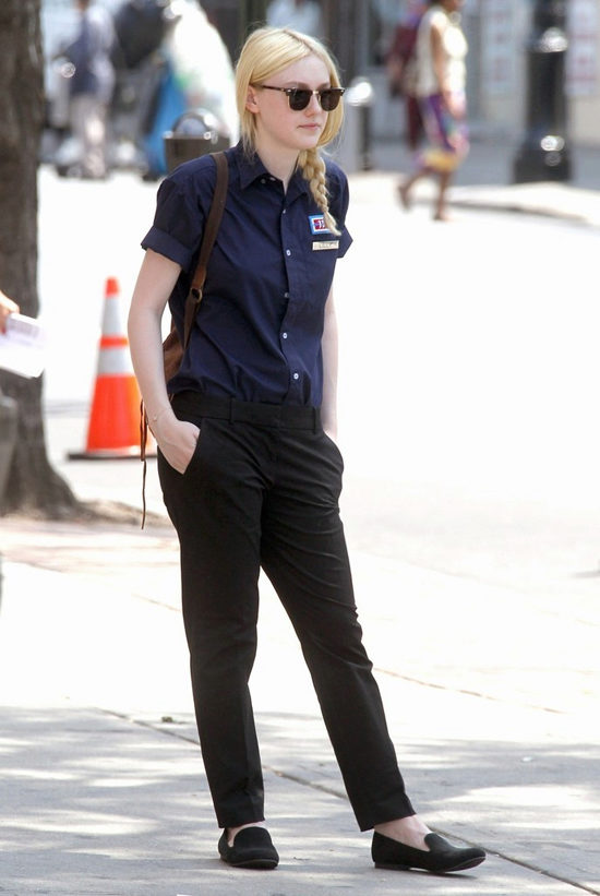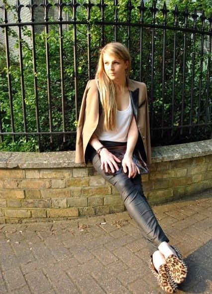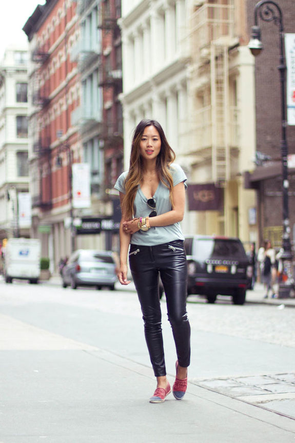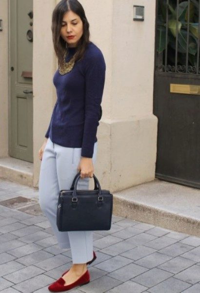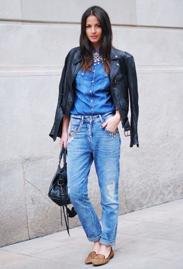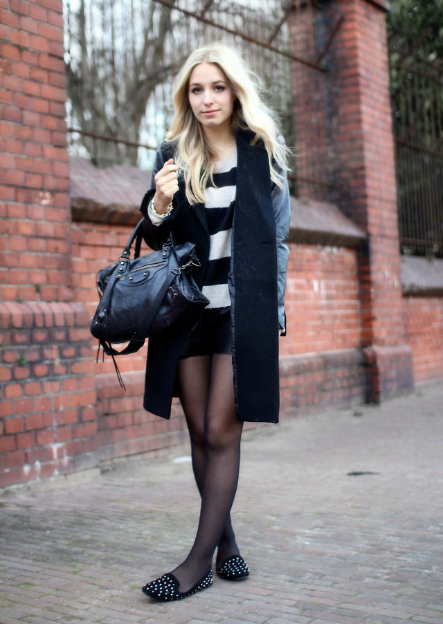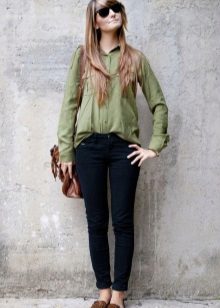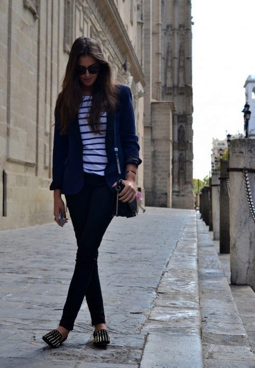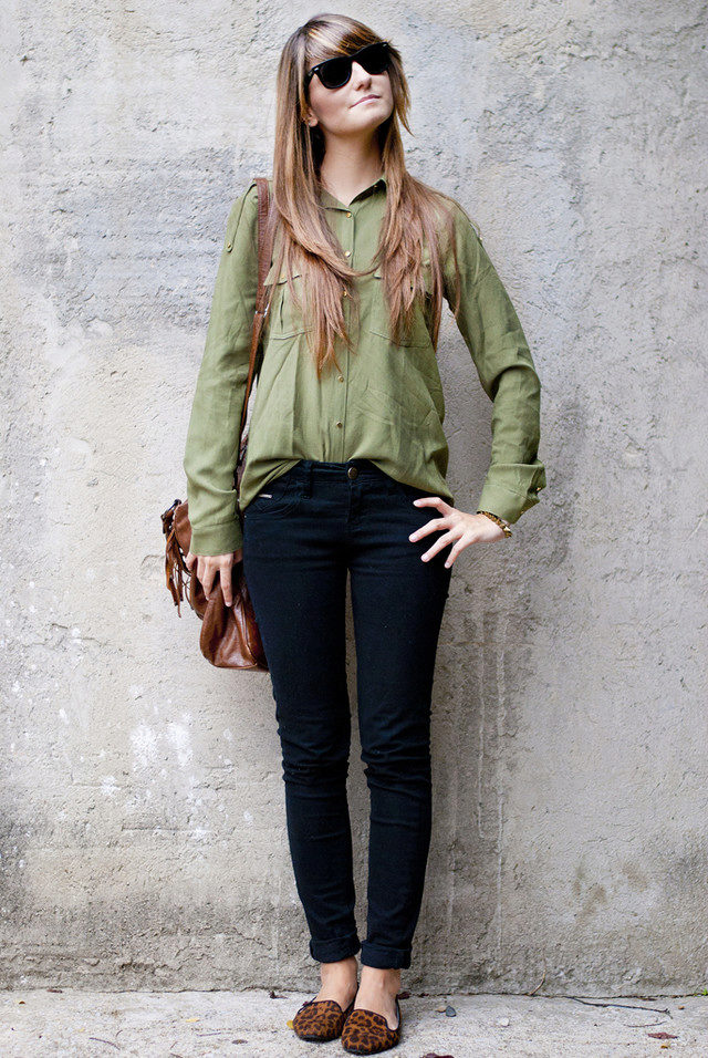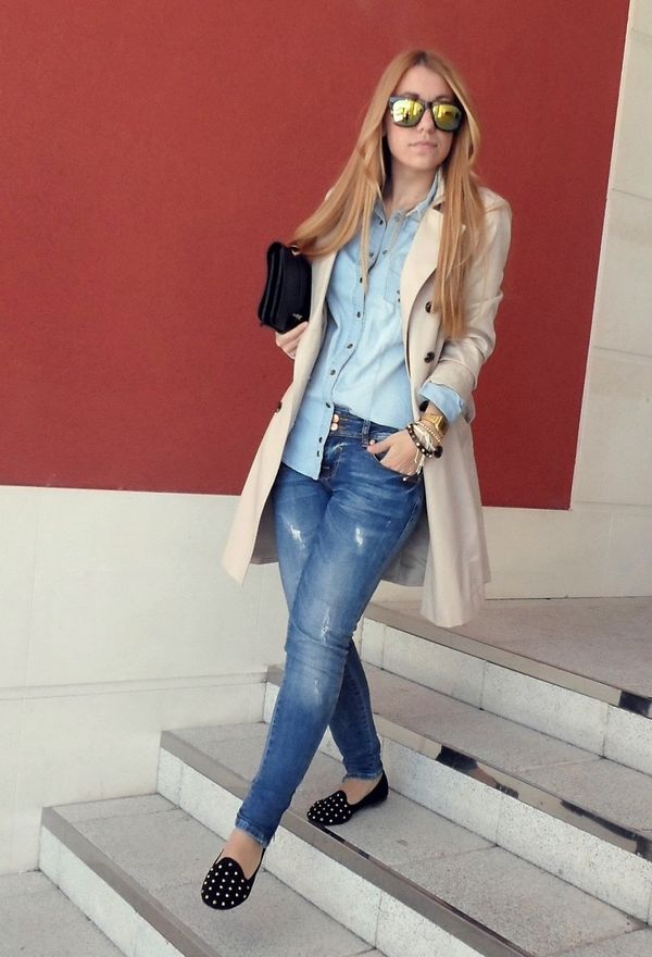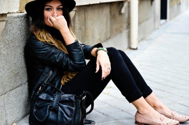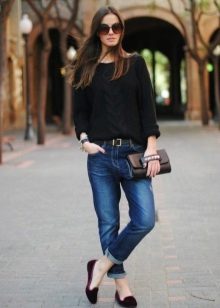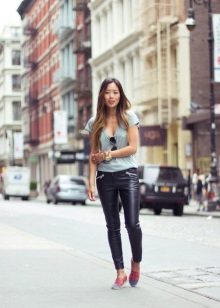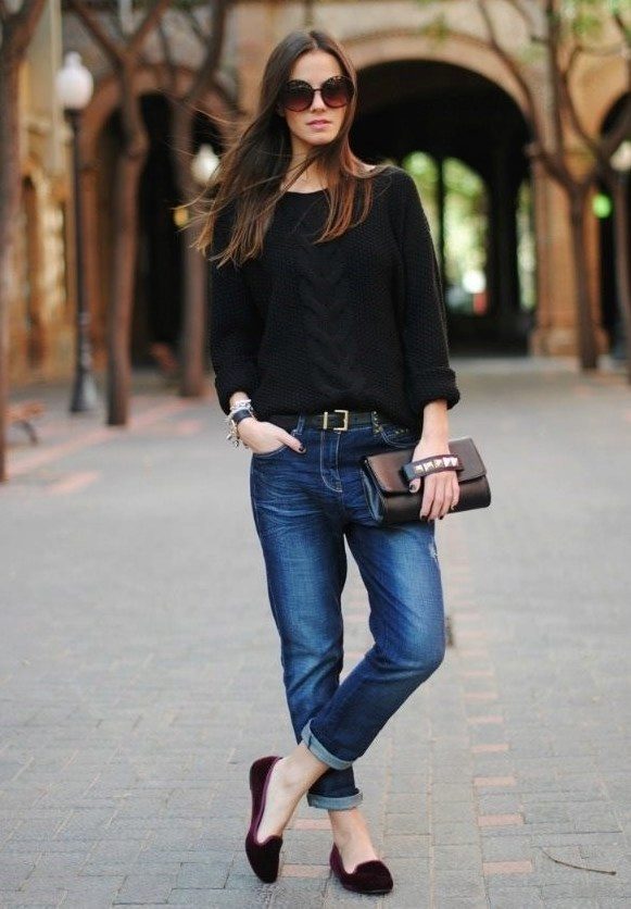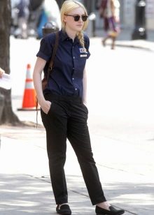 If you combine sleepers with a more feminine outfit, black shoes with a short flared skirt and a light blouse will be a win-win option. Laconic belt with a large buckle successfully complete the image.