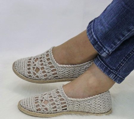 Hand-made lovers did not fall behind fashion and began to create street slippers, armed with threads and a crochet hook. To give homemade shoes the stability of her knitted linen or cotton. Despite the fact that they are created manually, the masters repeat all the design features of the sleepers: a rounded, slightly elongated toe, a comfortable backdrop, is knitted. They fit perfectly in a wardrobe for a summer holiday and will surely please fans of boho or hippie style.