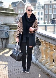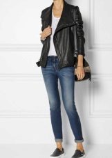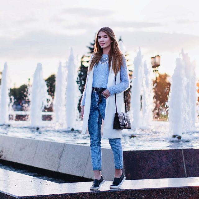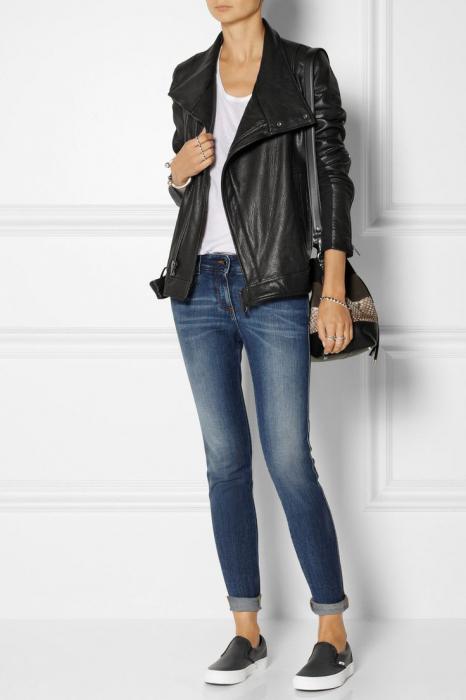 An interesting option for cool weather. Blue cropped and skinny jeans fit perfectly into the blue-blue range of the rest of the suit. Black slip-ons in combination with a small black handbag and a simple strict belt on the jeans make the image complete and perfect.