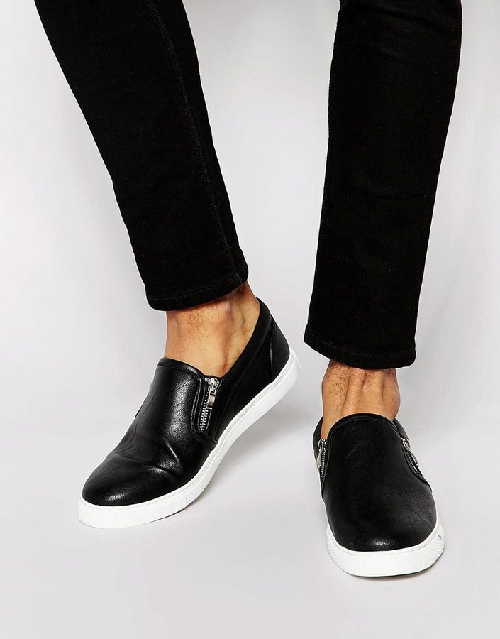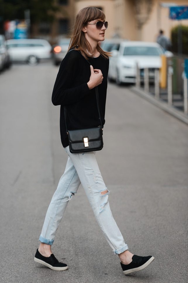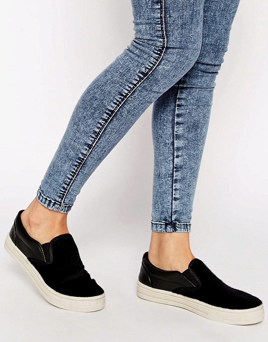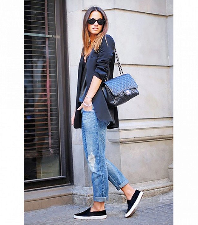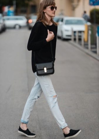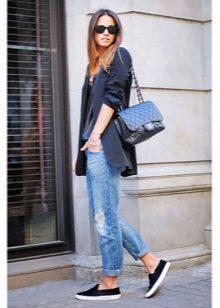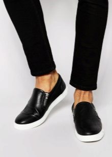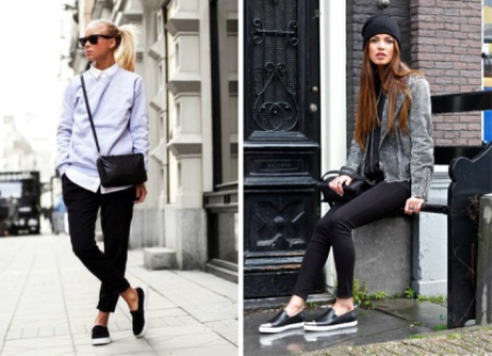 Black slip-ons with their fashionable design and classic color can be complemented by a variety of images. Even a casual look, complete with slip-ons, becomes interesting and unusual.