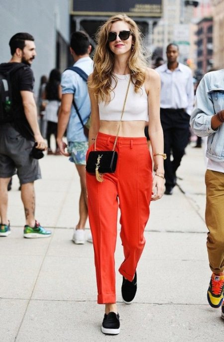 Bright red pants and top look very summer. Red with black is always a winning combination. Black slip-ons look good paired with a small black bag over the shoulder. Black accessories make the image brighter and more interesting.