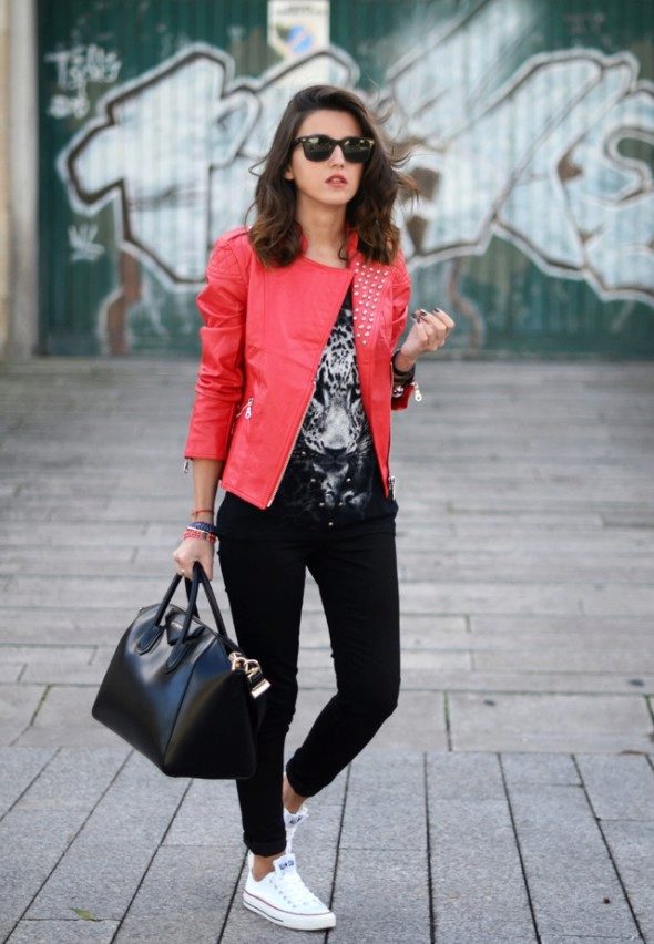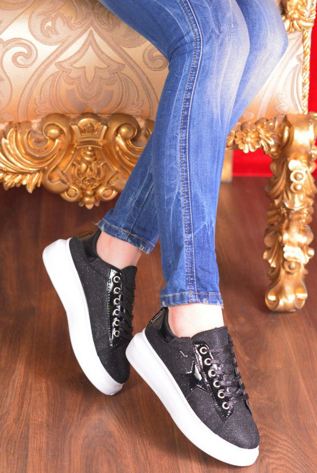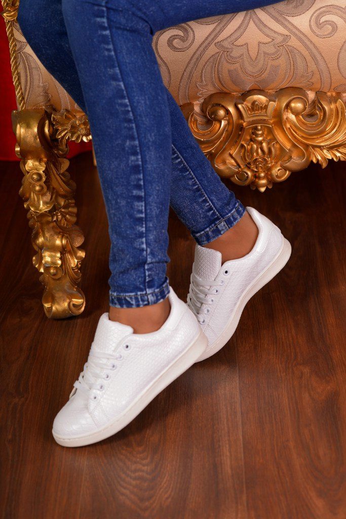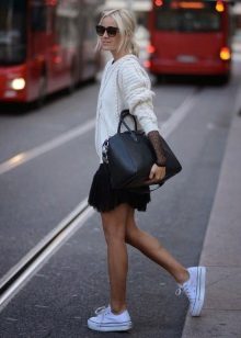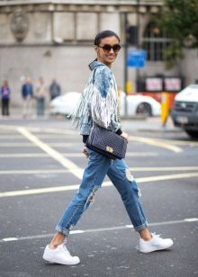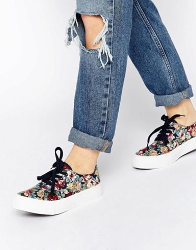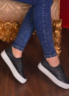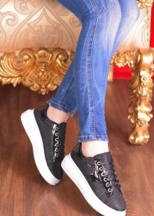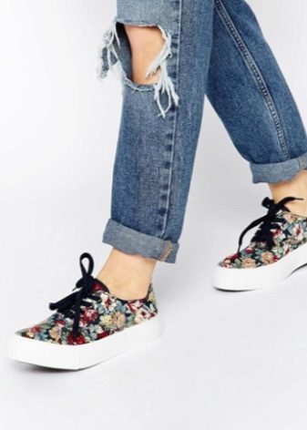 Lace-up slip-on sneakers perfectly combine with jeans and a regular T-shirt. Moreover, if the jeans are traditional colors, then shoes can be worn bright, with a catchy ornament or decor of pebbles and metal. At the same time, slip-ons can have a high platform or, on the contrary, a flat sole.