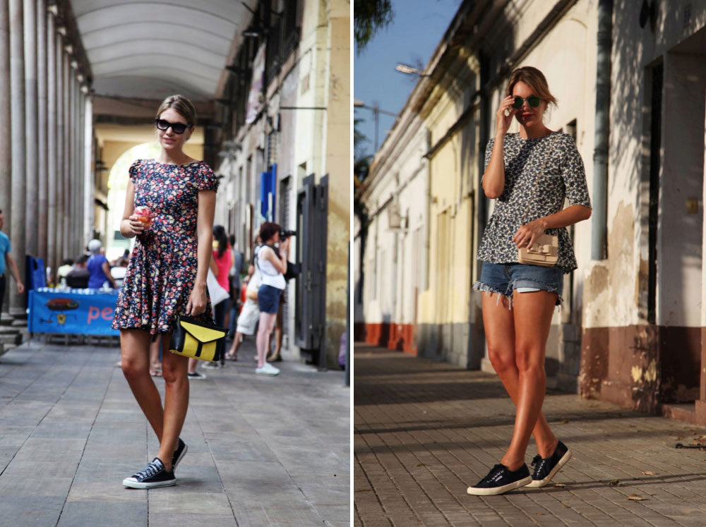 This shoe will make a perky duet with a denim jumpsuit - a great solution for shopping or meeting with friends. Also, slip-on slip-on sneakers look stylish with denim shorts.