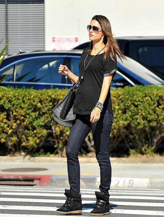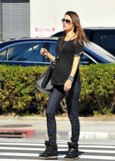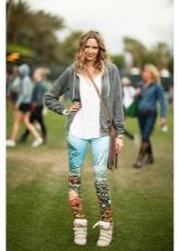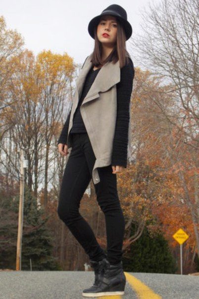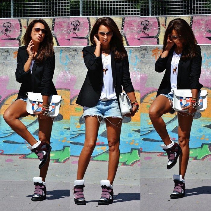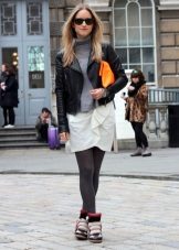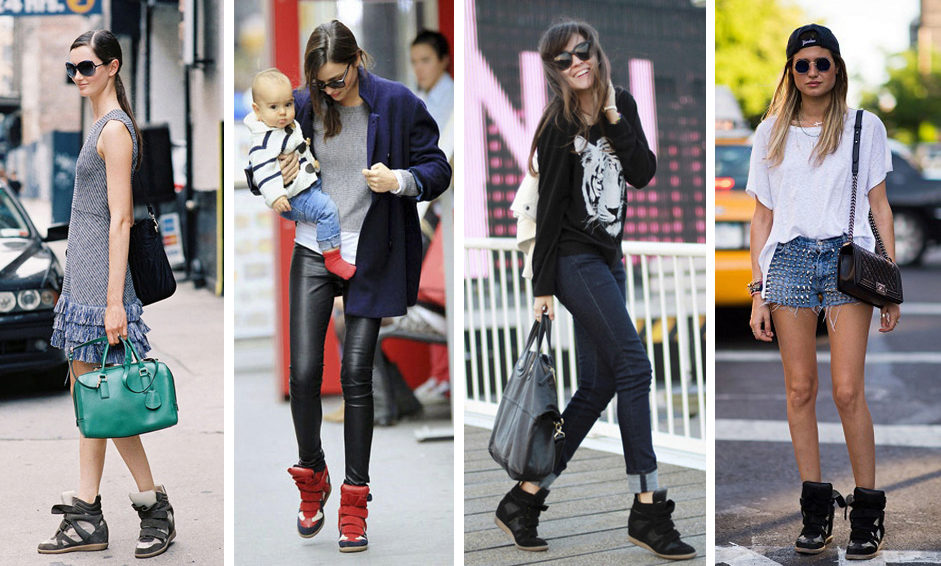 Sneakers on wedges perfectly combined with short skirts and shorts. When choosing a top, you should give preference to sweaters in a sweatshirt style, jackets over a T-shirt or thin fabrics shirts.