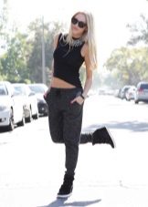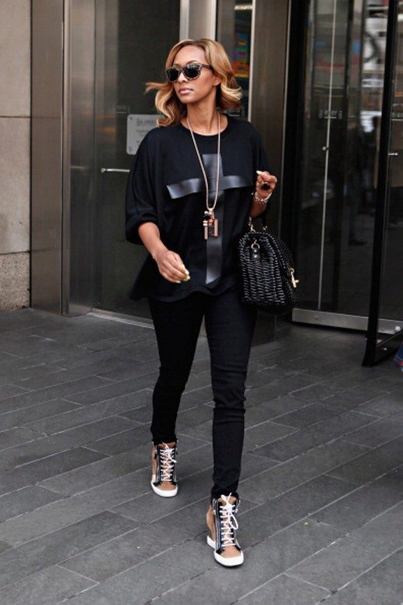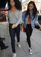 Snickers look great in combination with different models of tight-fitting trousers. You can complement the unique bow with a pullover made of thin fabric with bat sleeves or a t-shirt that fits your body. But remember that in such an ensemble pants must be tucked into sneakers.
