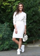 For the embodiment of a romantic image is to give preference to dresses. With white snickers, gray and white dresses look great. For a refined bow, wear a lace dress. Although many believe that such an ensemble is inappropriate, today it is the trend of the season. White sneakers can be worn with evening dresses.