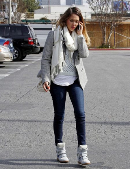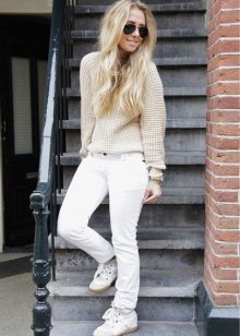 For the embodiment of a spectacular bow, you need to look at the models of suede. White sneakers are very capricious in their care. In bad rainy weather they should not be worn at all. They are ideal for creating solemn, evening bows.
