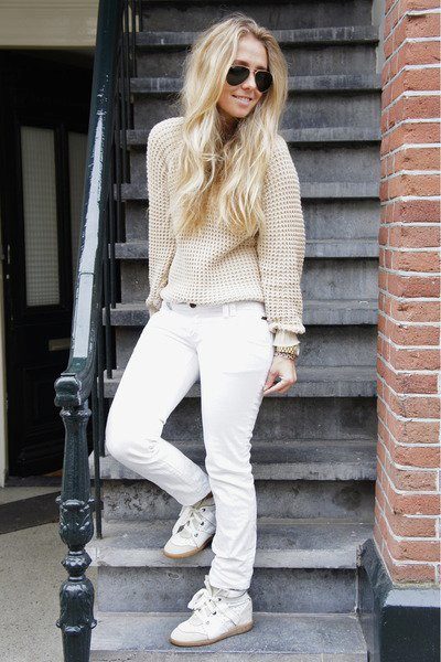 On cold days, a perfect bow can be created by combining white sneakers, a leather jacket and a warm dress or midi skirt. To create a casual bow, you can wear a tight, sporty-style slacks and dress with white sneakers.