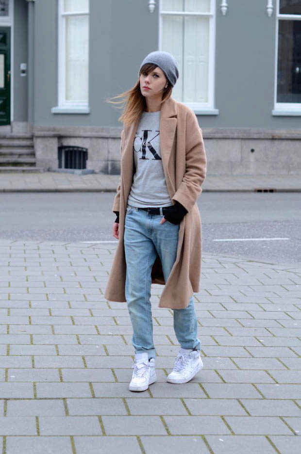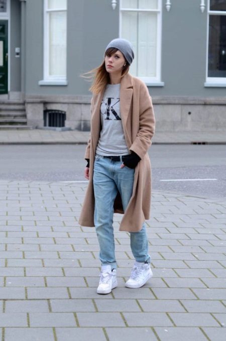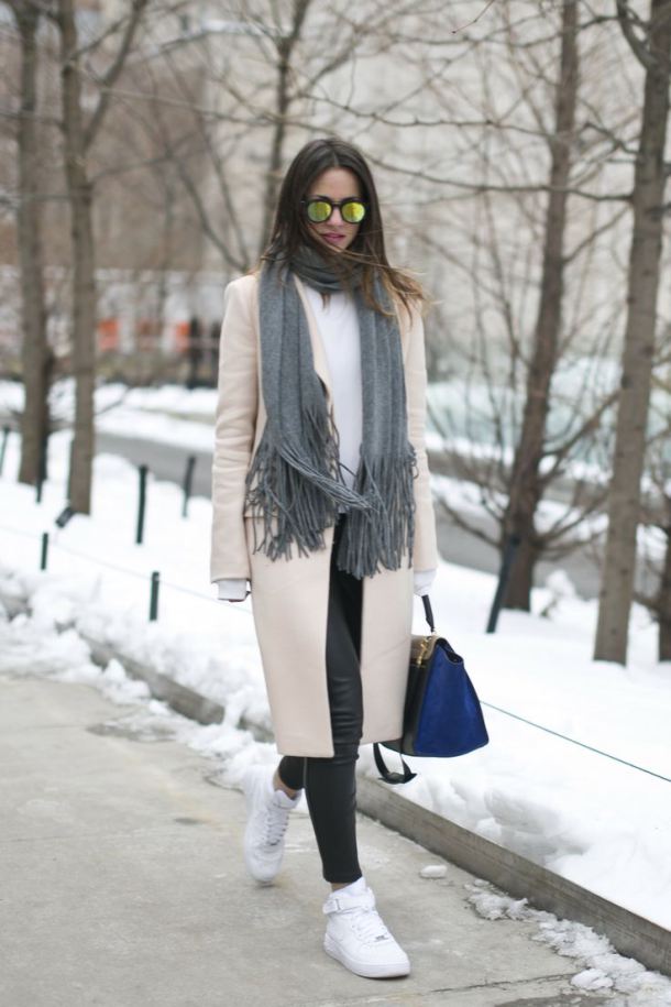 In the autumn season, white sneakers can be combined with a coat.Today in the trend beige trench coat that looks perfect in tandem with snow-white shoes.