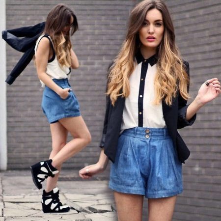 If you want to emphasize the play of colors, then you can wear denim shorts in combination with a light blouse and jacket.