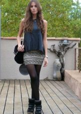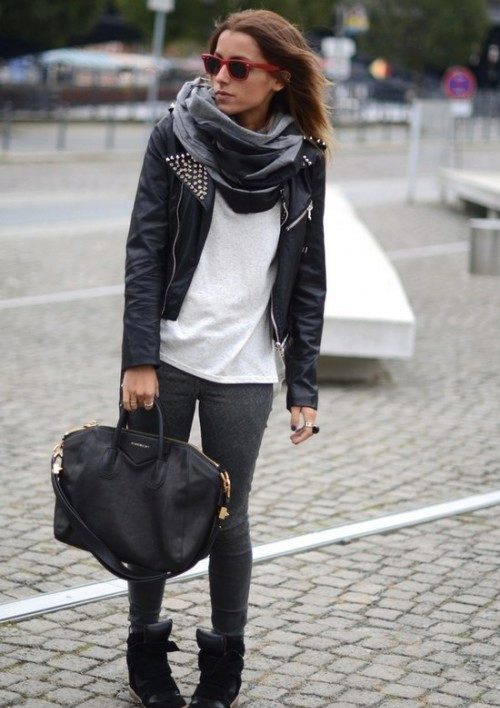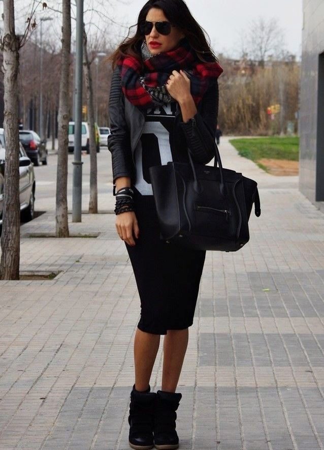 The combination of black sneakers with a slim-fitting skirt slightly below the knee looks feminine and romantic. A black jacket-jersey over a black jacket with a white print will add harmony to the image. A long scarf in a cage will be a bright accessory of a stylish bow.