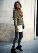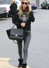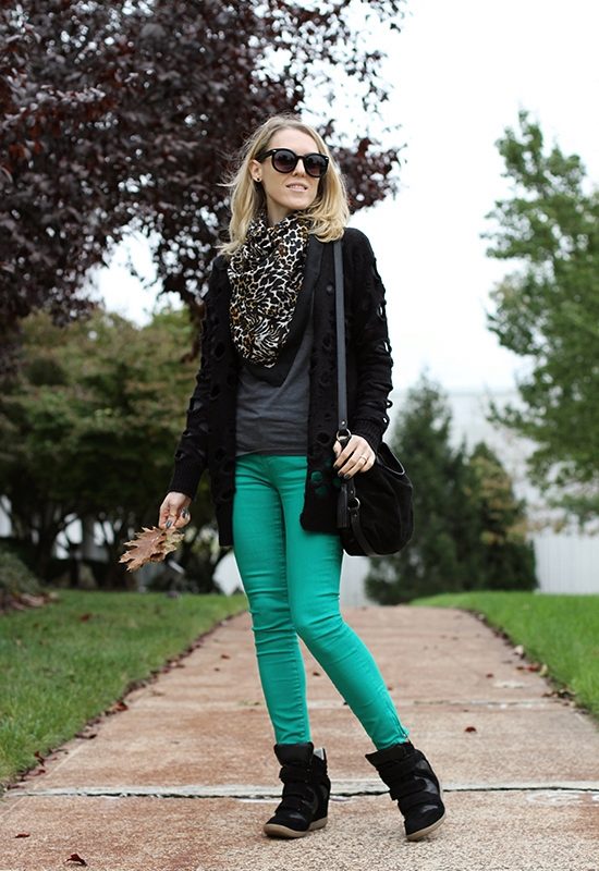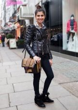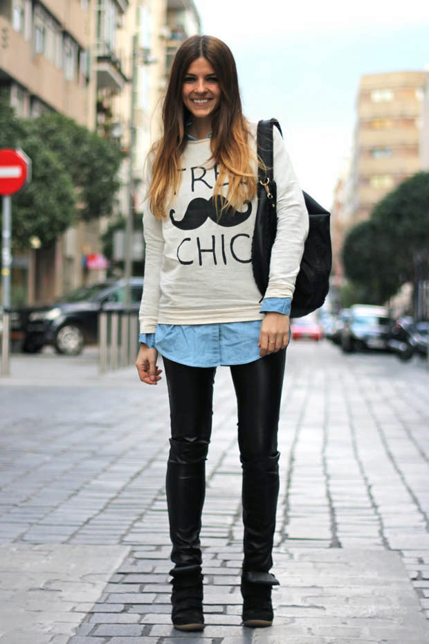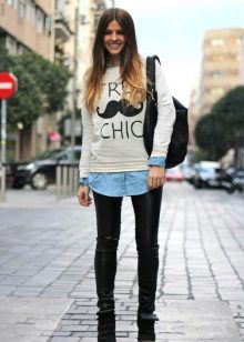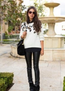 Do not forget about leggings and juggins in combination with a sweater with an elongated cut or a tunic. The final touch is black sneakers. Leather trousers, a bright top and black sneakers with rhinestones are perfect for a stylish party.