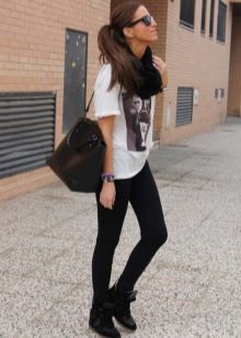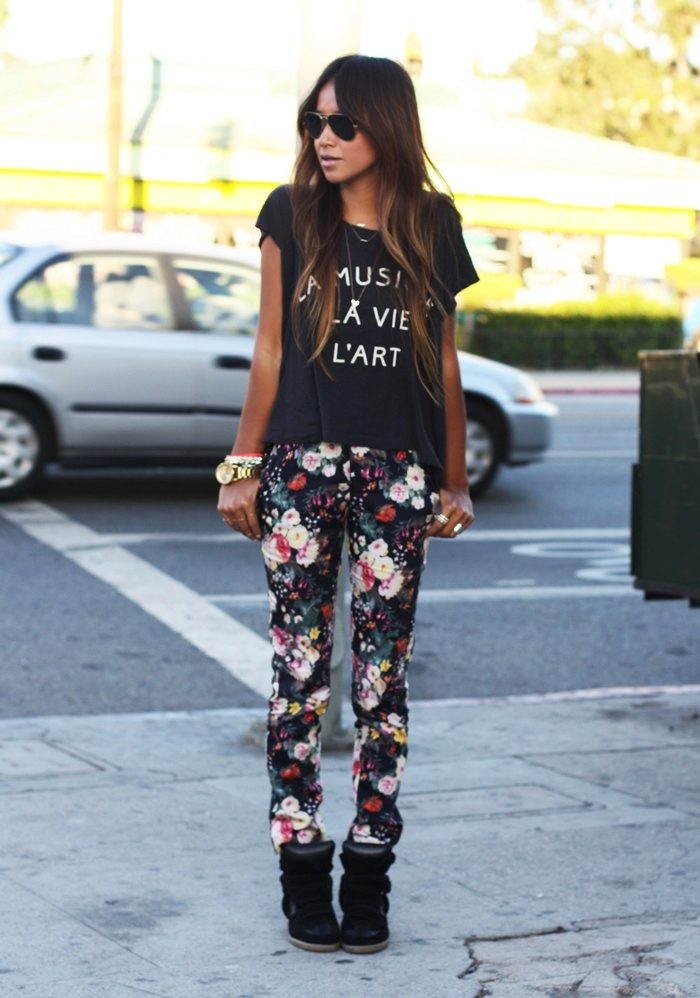 To embody a bright youth bow, black sneakers on a wedge should be combined with black trousers decorated with a floral print, and a black T-shirt and white lettering.