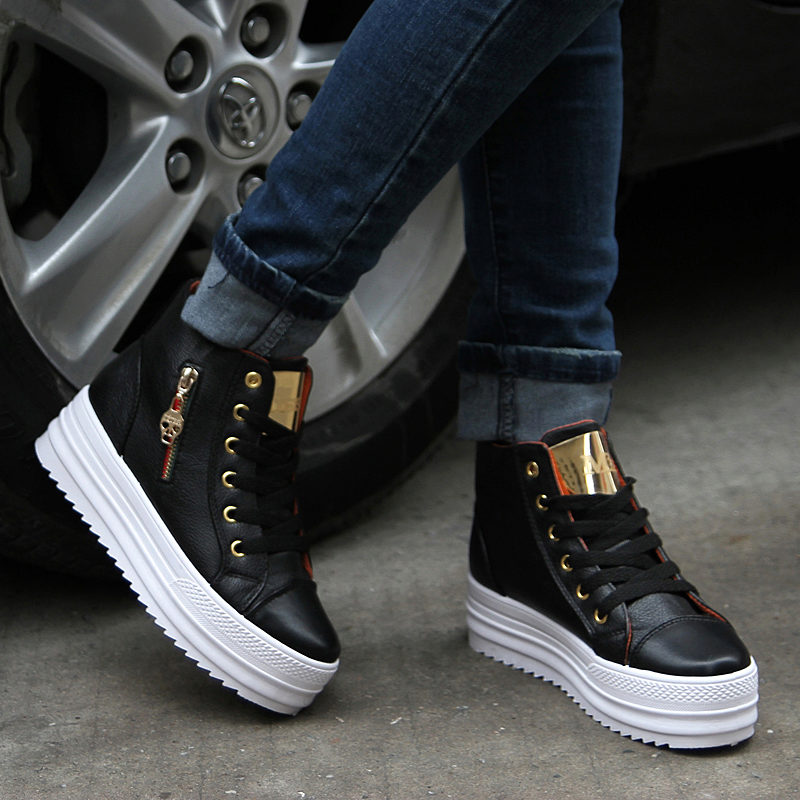 - Genuine Leather. Girls who prefer an active lifestyle, get black leather sneakers due to their practicality. Genuine leather shoes can be worn in any weather, as it is not afraid of rain and dirt. Designers use a variety of decorative elements to give black leather models brightness and unusual. Today in a trend sneakers with chains, spikes or rhinestones. Varnished quilted leather shoes are extremely popular.
