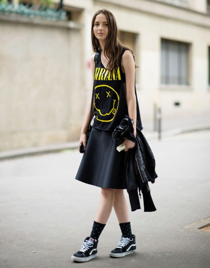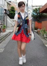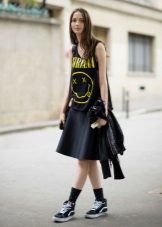 Snickers look good with skirts of various styles and lengths. For example, if a girl puts on a model in the fold, turtleneck and vest, you get a suitable ensemble for school.
