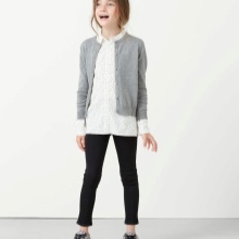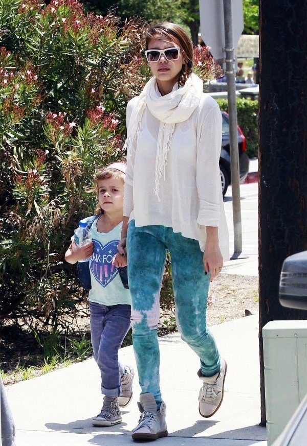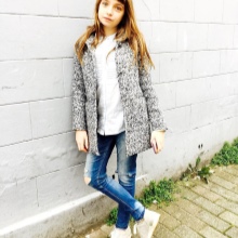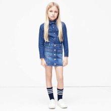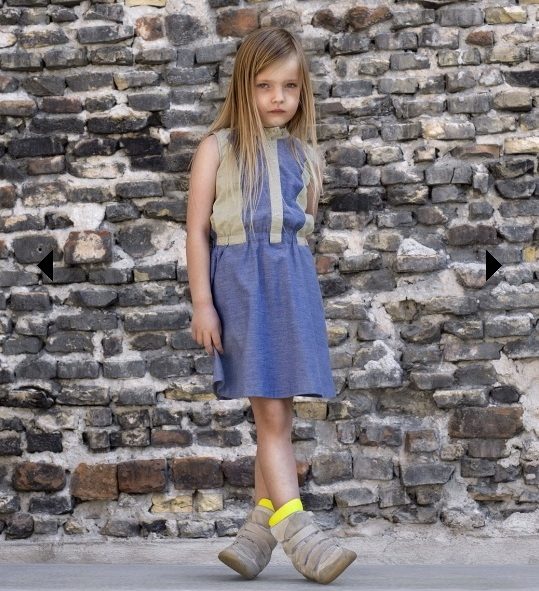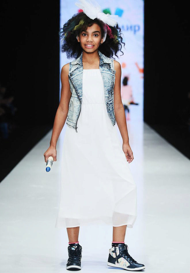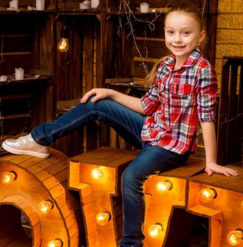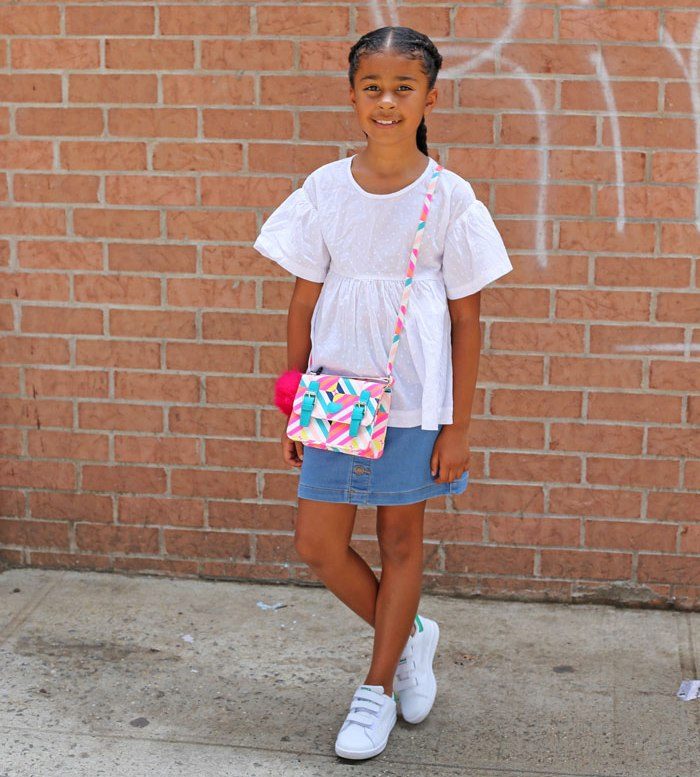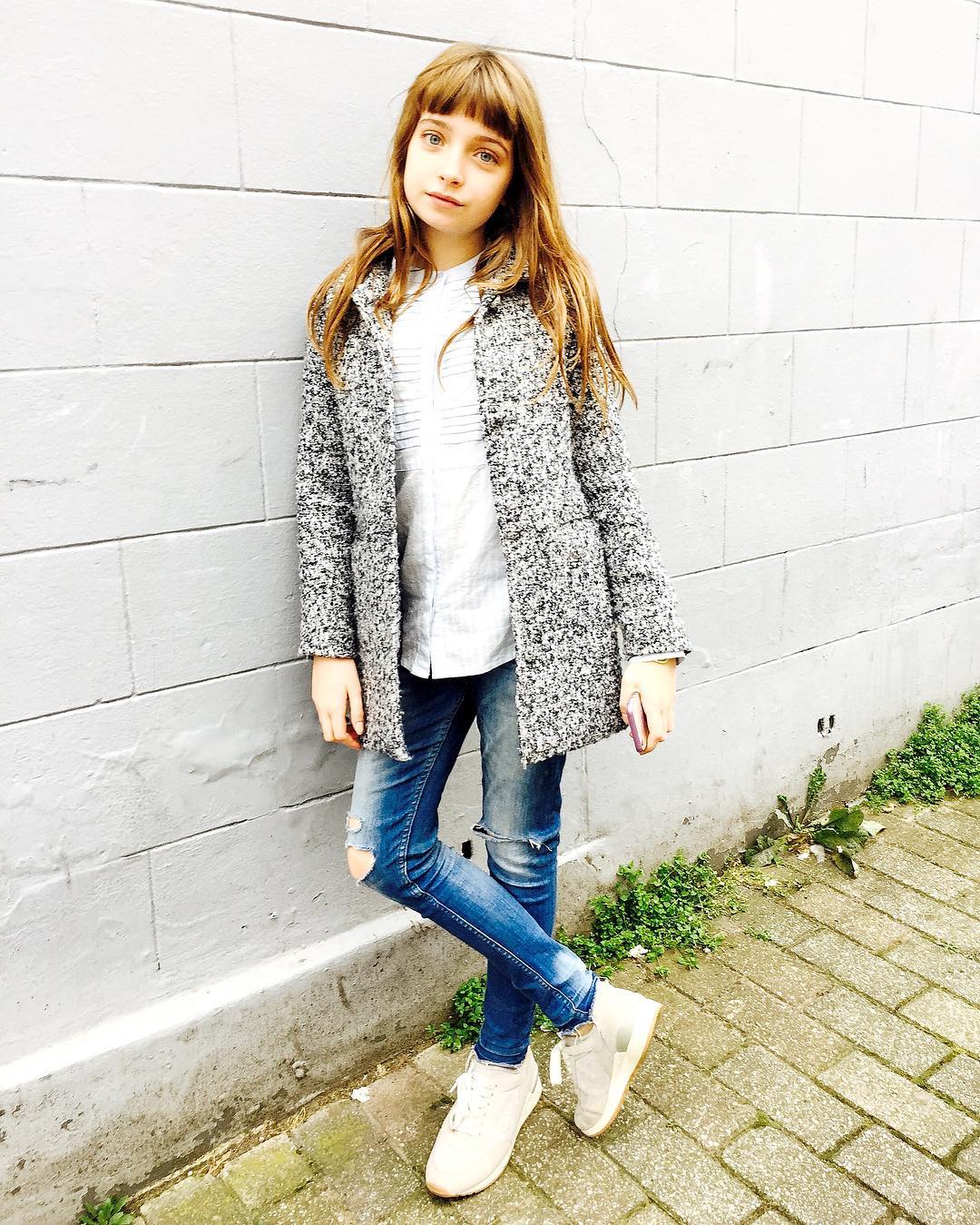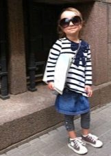 A little fashionista in stylish appearance does not lag behind her mom at all. The girl, who looks about 8 years old, is shod in fashionable sneakers of neutral colors. Made in a light gray color, they have a white toe and sole. The model is decorated with buckles in the form of wide straps with buckles. Snickers are ideally combined with a baby's outfit - cropped light blue jeans, a vest made of the same material, but of a darker shade and a white T-shirt with a girl's pattern - a heart. Ideal for walking around the city with my mother, who is dressed in the same way.
