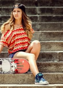 The orientation of the image in this case will determine the top. If a girl likes a sporty style, then she needs to wear a voluminous sweatshirt, sweatshirt, a spacious plaid shirt or tank top. The result will be fervent and a little audacious image.