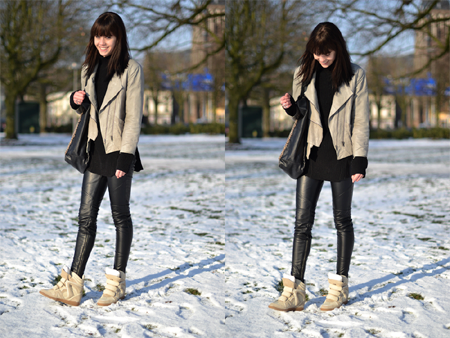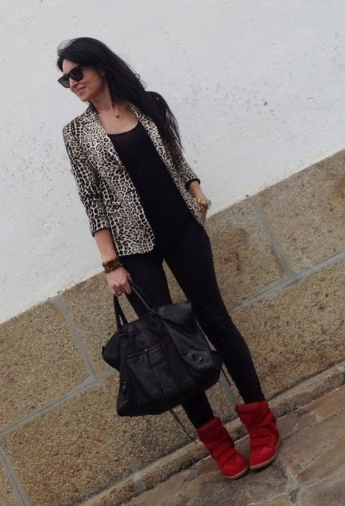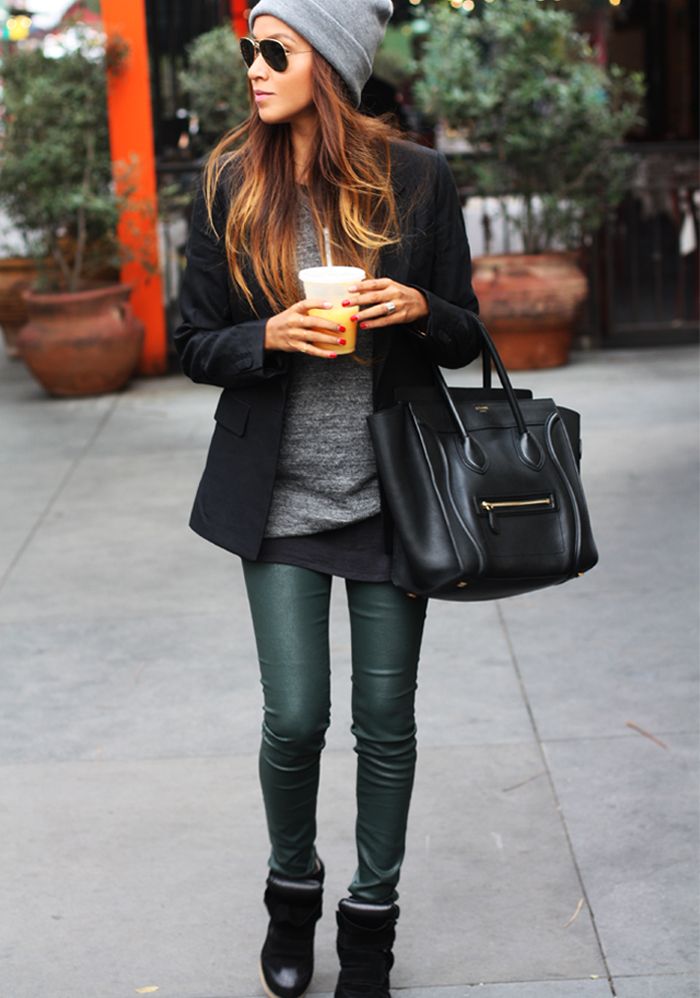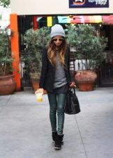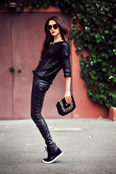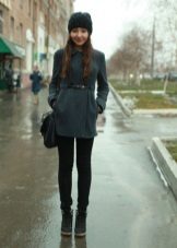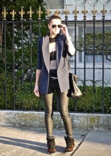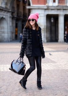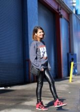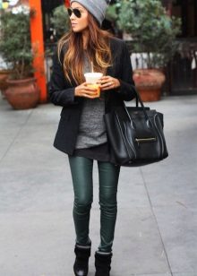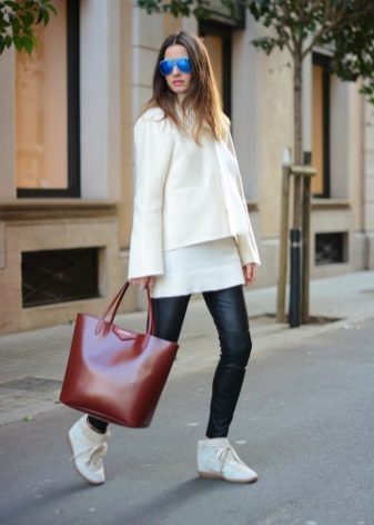 - Black leggings from a material that imitates leather look great with an elongated black sweater, but this combination may seem rather gloomy, which is why it is worth a little to dilute the gloomy colors with a light beige jacket and sneakers of the same shade.