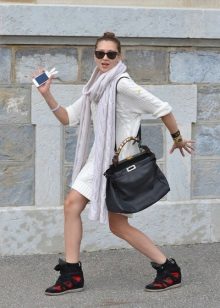 A rather unusual combination of sneakers and dresses may seem. But here it is worth being careful, because not every product will fit. Look great models of different lengths, sewn from fine quality knitwear. In some cases, tight dresses made of delicate lace or charming velvet can also come up.